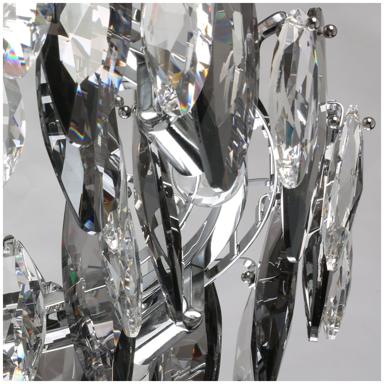 Металлическое основание светильника гальванизировано в цвет хрома. Светильник декорирован хрусталем оригинальной формы со сложной огранкой прозрачного и дымчатого цвета.