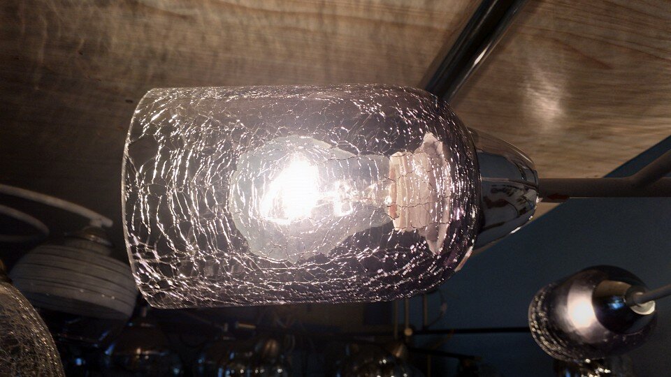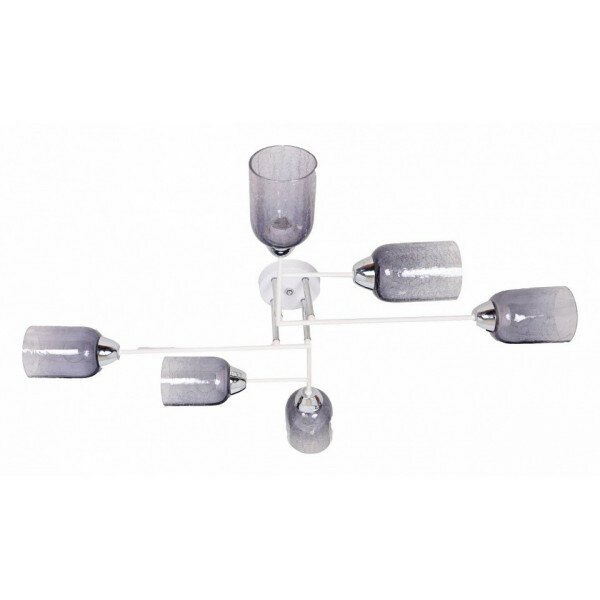 Металлическое основание потолочной люстры окрашено в белый цвет. Отдельные элементы основания гальванизированы в цвет хрома. Стеклянные плафоны выдуваются в форму, кракелированы и градиентно гальванизированы в дымчато-серый цвет.