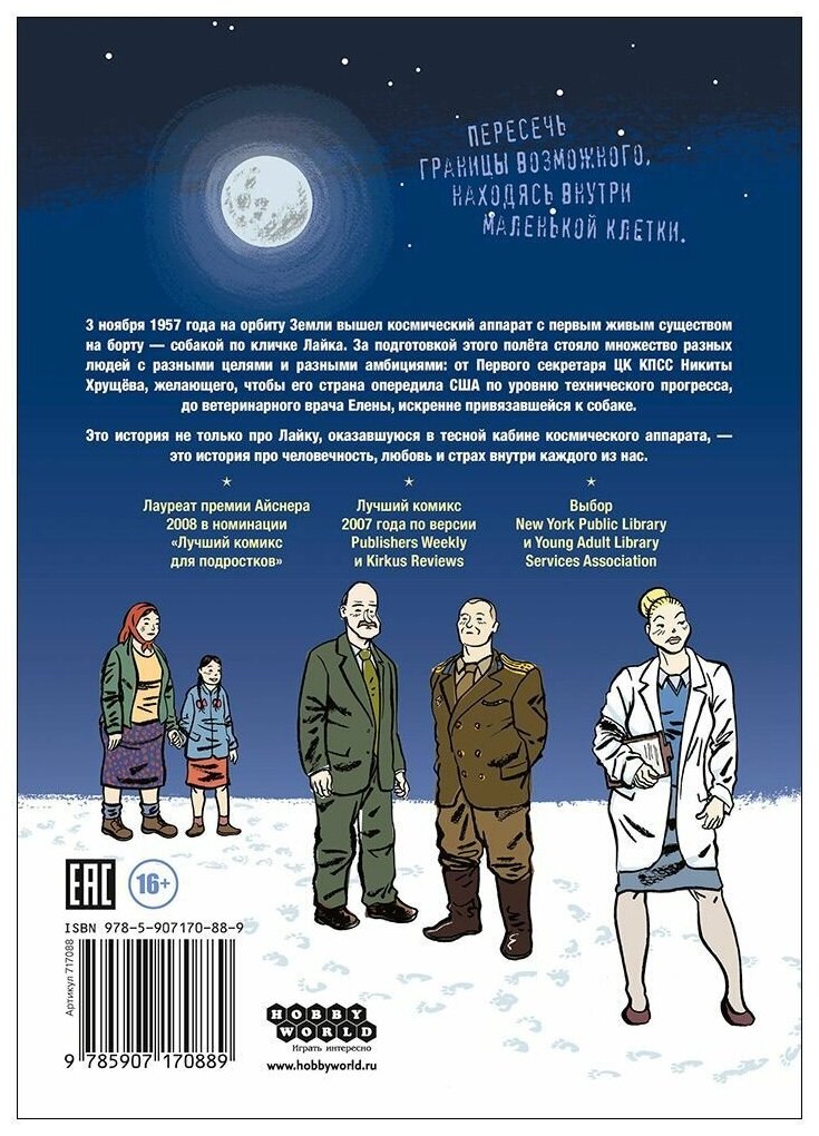 Лайка - первое живое существо, что оказалось на космической орбите Земли. Маленькая дворняжка, заброшенная для эксперимента в космос, не должна была вернуться, такой возможности конструкторы не предусматривали. В этой истории причудливо переплетаются жизни нескольких человек, связанных между собой полётом Лайки: гениального конструктора Королёва, Хрущёва, стремящегося опередить США в развитии космической программы, ветеринара Елены, что отвечает за здоровье испытуемой собаки... За историей обречённого животного Ник Абадзис находит историю о скрытой глубоко внутри человечности.