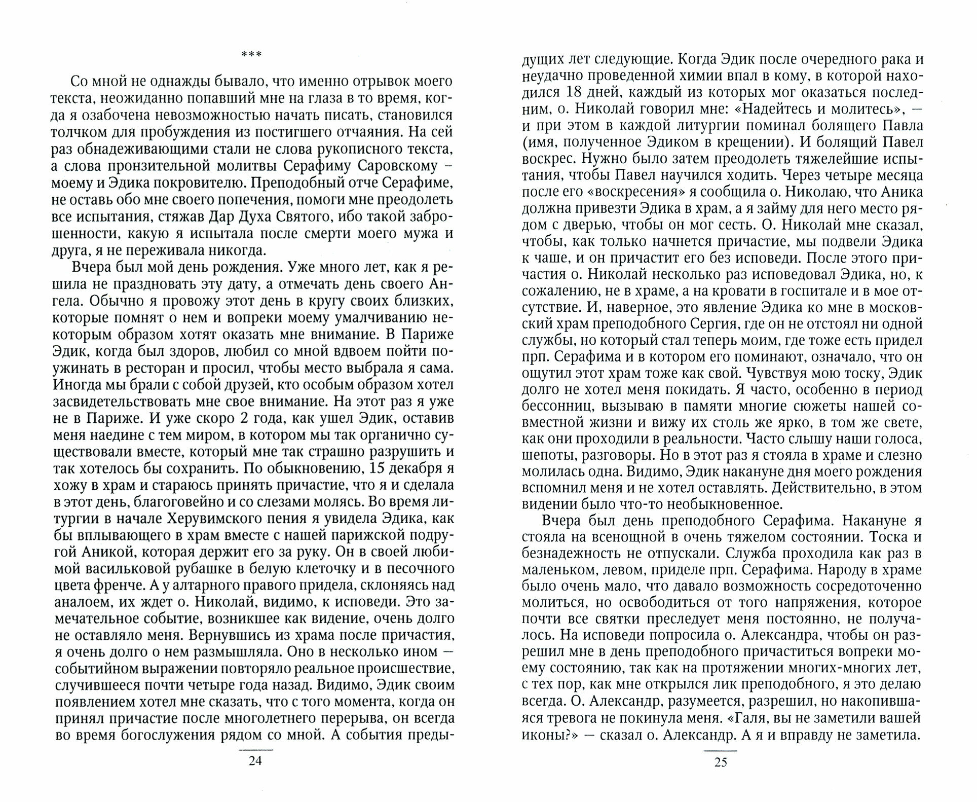 Книга киноведа Галины Маневич, вдовы выдающегося художника Эдуарда Штейнберга, представляет собой дневниковые записи 2014-2021 годов. Это доверительный рассказ автора о своей жизни. В её книгах, вышедших ранее в издательстве, "На пути" и "Из двенадцати тетрадей", отражен опыт предыдущих лет жизни, испытаний, преодолений, потерь и обретений. Эта книга продолжает начатое, расширяет то, что в прежних лишь намечалось. Разумеется, огромное место в воспоминаниях Галины Маневич принадлежит её мужу Эдуарду Штейнбергу. Ей посчастливилось прожить много лет рядом с этим замечательным человеком и большим художником. Но, пожалуй, основная "тема" дневников Маневич - её глубокая вера, её "жизнь в церкви". И главный "герой" этой книги - её духовный наставник отец Николай (настоятель церкви прп. Серафима Саровского в Париже отец Николай Чернокрак).