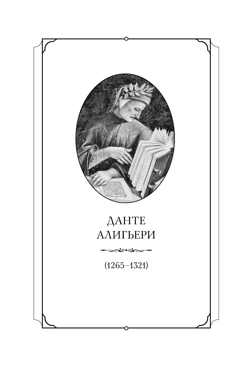 создатель современного итальянского языка. Свое главное произведение — непревзойденную, величественную, истинно божественную «Комедию» он посвятил состояниям человеческих душ в жутких кругах Ада, на трудных уступах Чистилища, в гармоничных небесах Рая. Читатель «Божественной комедии» следует за Данте, созерцая все модели человеческой жизни и посмертной судьбы: одни персонажи навсегда погрязли в грехе, другие застигнуты автором на переходной стадии к добродетели, третьим дарован путь к совершенству. Гениальная структура «Божественной комедии» соотносится с воздушными сферами Розы Рая, где поэту уготована встреча с боготворимой им Беатриче.