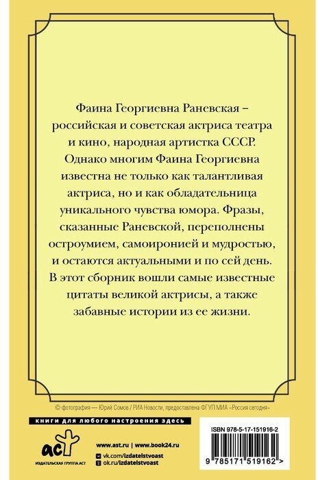 Положить на стол и перечитывать, перечитывать, перечитывать. Наверное, лучший экземпляр афоризмов и притч Фаины Георгиевны Раневской. Собраны все любимые высказывания знаменитой актрисы. Формат небольшой, удобно брать с собой, чтобы везде можно было насладиться чтением. Качество печати хорошее, листы не просвечивают. Книга отлично поднимает настроение и даже затсавляет посмотреть на окружающее в другом свете.