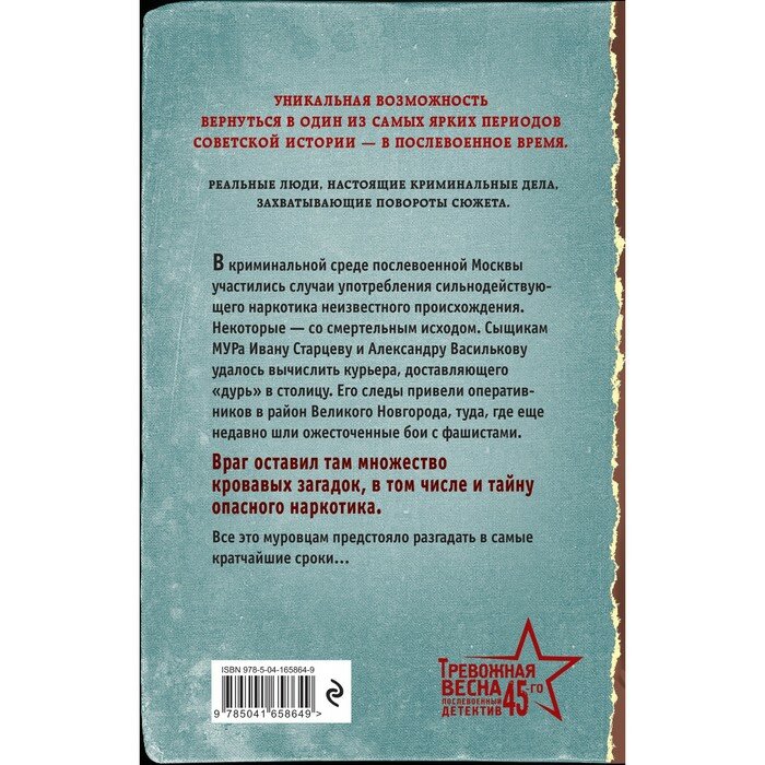 В криминальной среде послевоенной Москвы участились случаи употребления сильнодействующего наркотика неизвестного происхождения. Некоторые — со смертельным исходом. Сыщикам МУРа Ивану Старцеву и Александру Василькову удалось вычислить курьера, доставляющего «дурь» в столицу. Его следы привели оперативников в район Великого Новгорода, туда, где еще недавно шли ожесточенные бои с фашистами. Враг оставил там множество кровавых загадок, в том числе и тайну опасного наркотика. Все это муровцам предстояло разгадать в самые кратчайшие сроки…