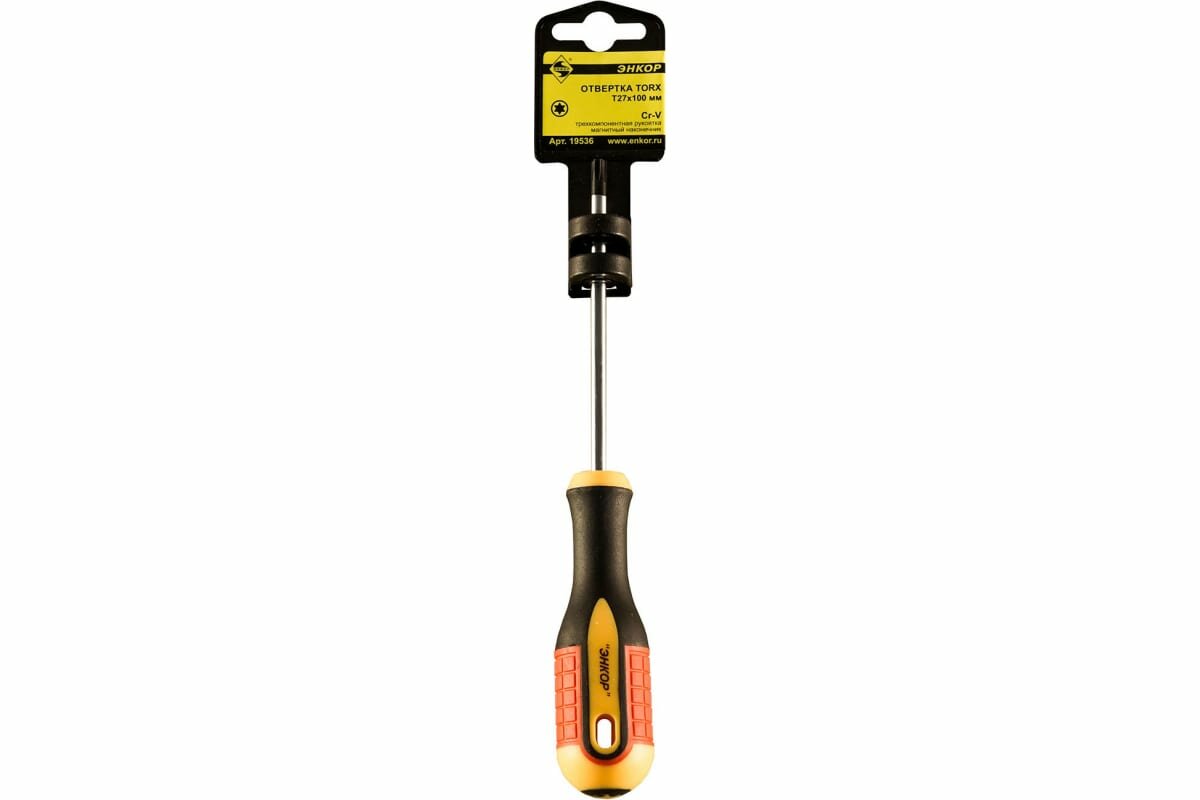 Отвертка Энкор Torx T27x100мм трех комп рук предназначен для работ с резьбовыми соединениями. Стержень отвертки выполнен из качественной хромованадиевой стали, что обеспечивает прочность и долговечность. Эргономичная трехкомпонентная рукоятка гарантирует надежный хват и комфортную эксплуатацию. Намагниченный наконечник надежно удерживает крепеж при работе.