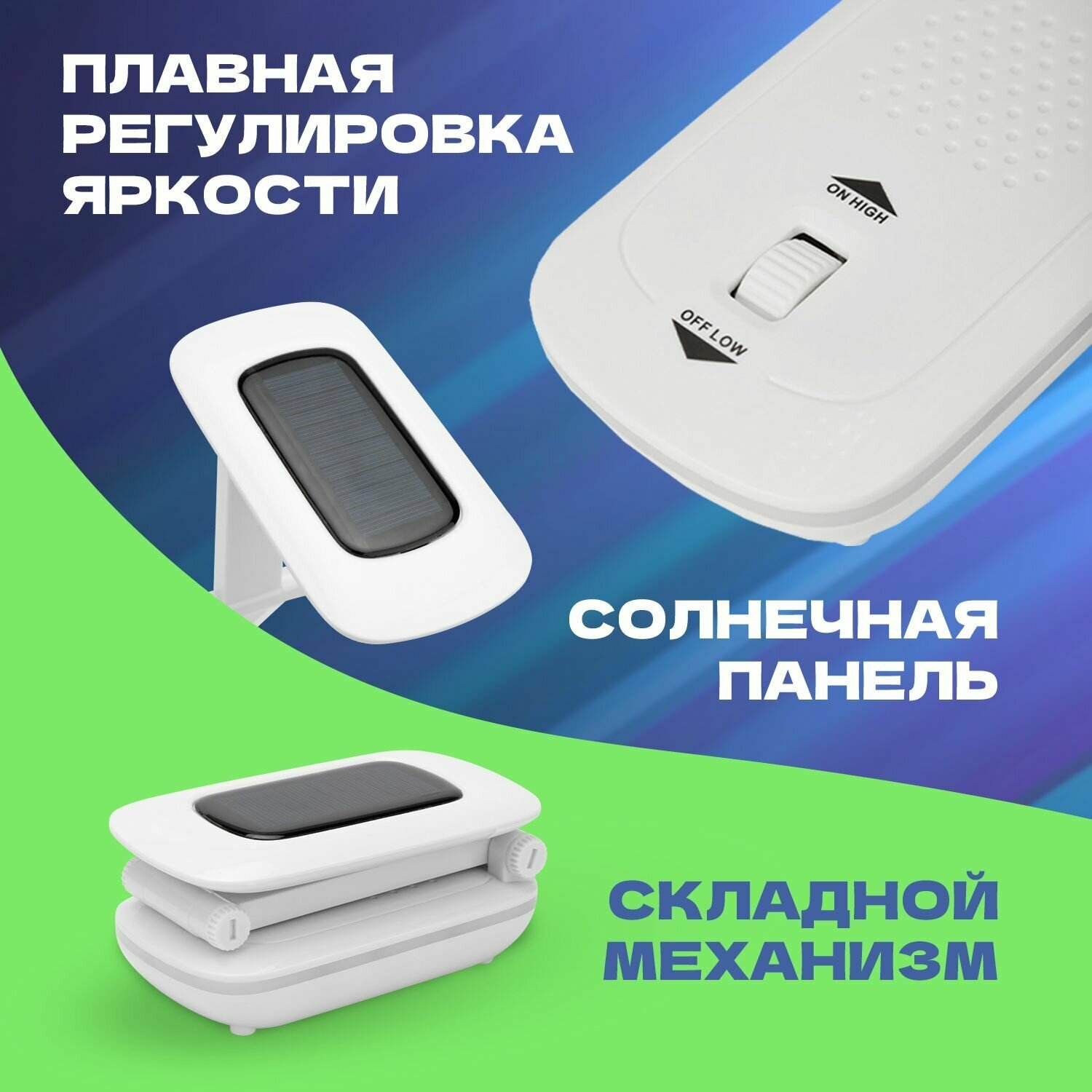 Работает от стандартной сети 220 В и не требует дополнительных источников питания. Солнечная панель позволяет производить зарядку светильника от солнца даже там, где отсутствует электроэнергия. Встроенный аккумулятор сохранит освещение без подзарядки до 2 часов.