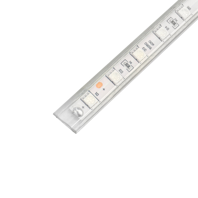 Светодиодная лента 220 В повышенной яркости представляет собой гибкую PCB панель, напоминающую тончайшую ленту, на которую нанесены светодиоды SMD5050. PCB панель со всех сторон обволакивает прозрачная герметичная изоляция, благодаря которой лента защищена от механических повреждений и может работать находясь под тяжелым воздействием окружающей среды. Сейчас светодиодная лента 220 В особенно популярна при использовании в сфере дизайна интерьеров, для контуровки фасадов зданий, подсветки световых коробов, а также в быту для подсветки потолков и всевозможных ниш. Ленту 220 В удобно использовать при подсветке больших длин, потому что не требуется никакого дополнительного оборудования, знаний по расчету сложных схем с многочисленными блоками питания и каких-либо специальных умений и навыков. Благодаря тому, что ленту можно резать кратно метру, не возникнет сложности в подборе нужной длины. Использование светодиодов, наиболее долговечных источников света, позволяет подсветить объект один раз и не беспокоиться о ремонте и замене еще долгие годы.При подключении светодиодной ленты к соединительному разъему (муфте), необходимо заизолировать свободное воздушное пространство соединительного разъема (муфты) морозостойким силиконовым герметиком, предотвращающим попадание влаги. Сверху данного соединения необходимо использовать термоусаживаемую трубку.