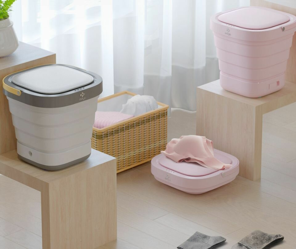 2 в 1: складная стиральная машина и стерилизационная машина. Стирает, обрабатывает вещи и сливает воду за считанные минуты. Сушить, конечно, она будет дольше – но за счет своей компактности она все равно выигрывает.