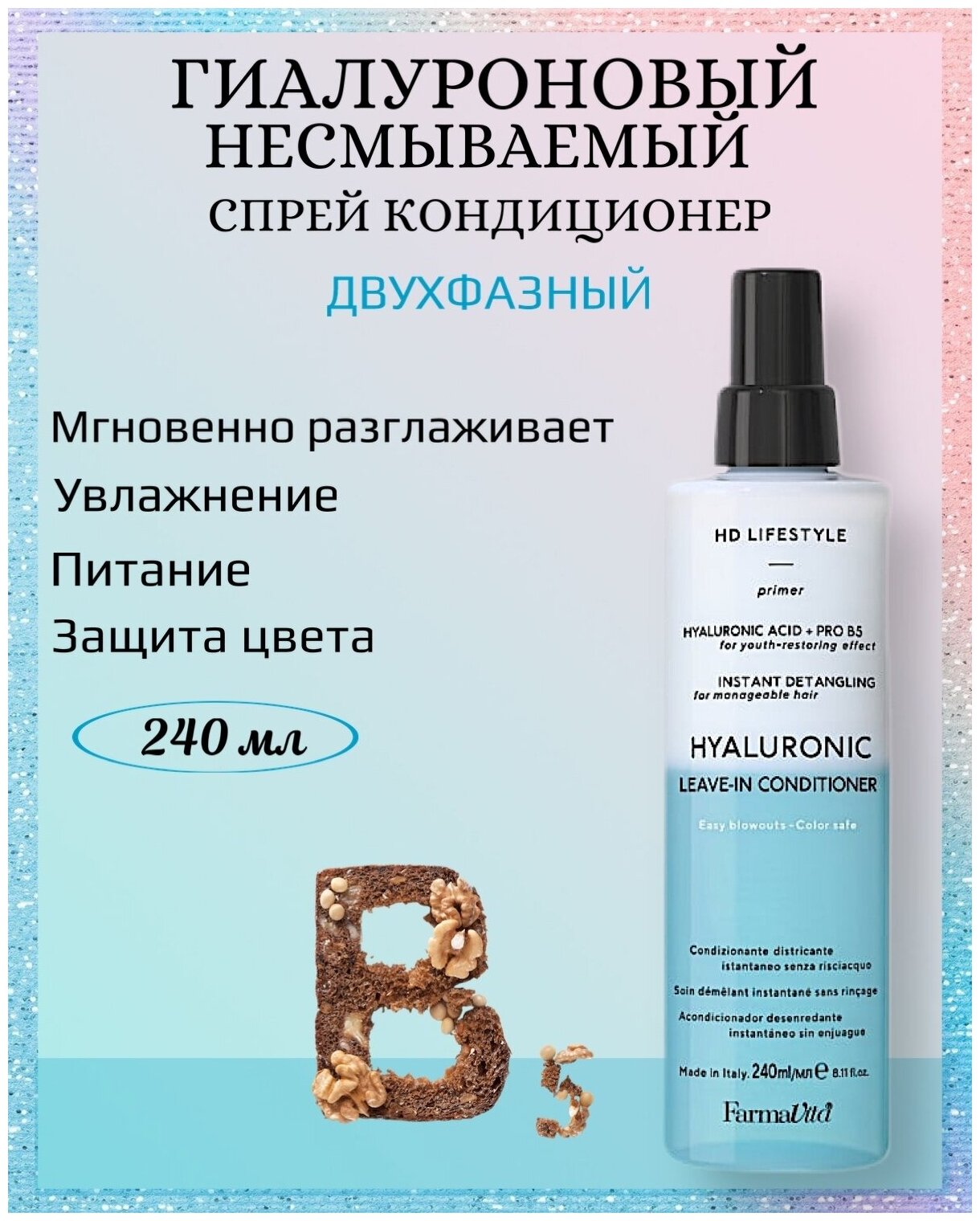 Способ применения: Тщательно взболтать, равномерно распылить спрей на чистые влажные волосы.