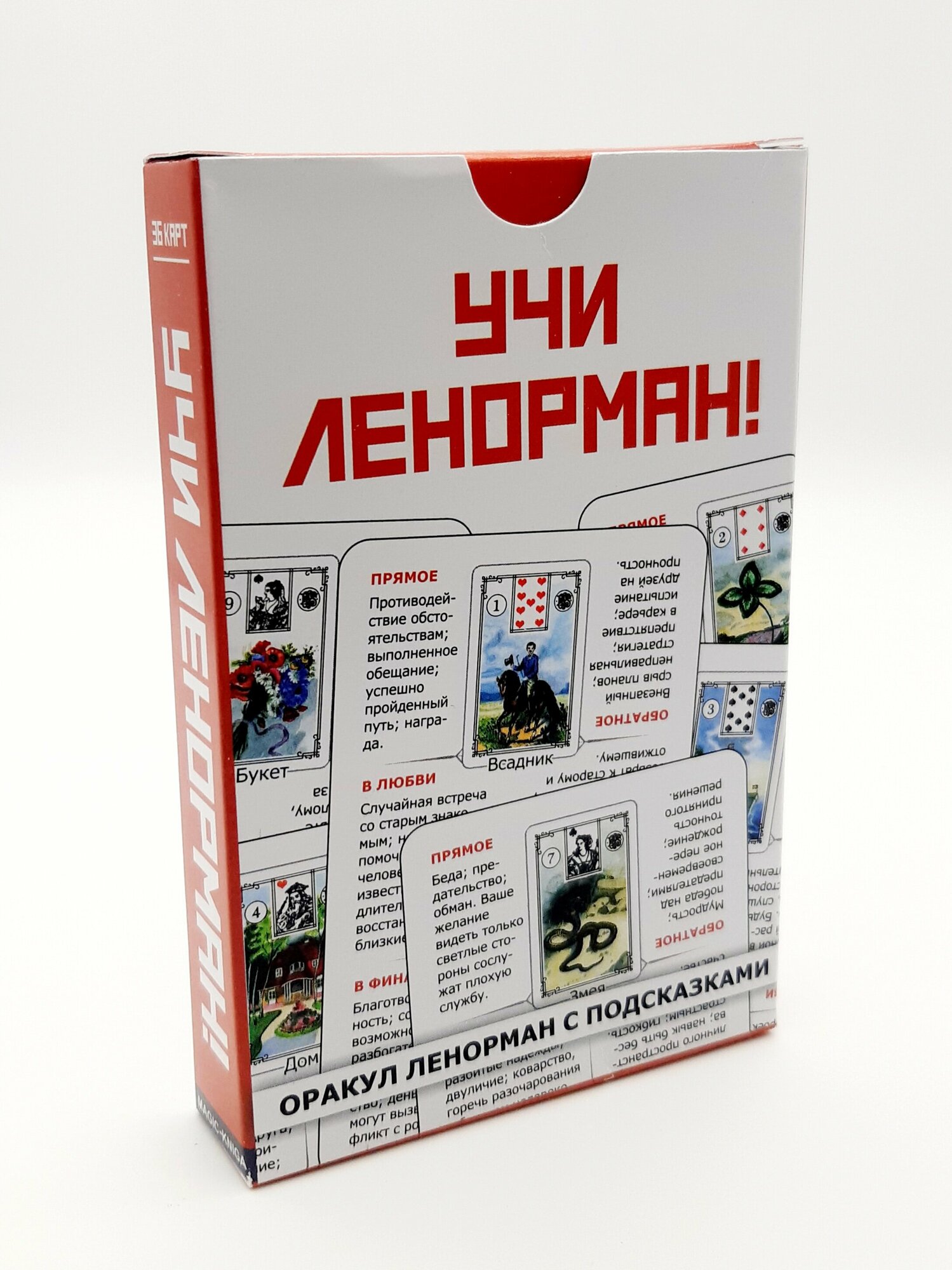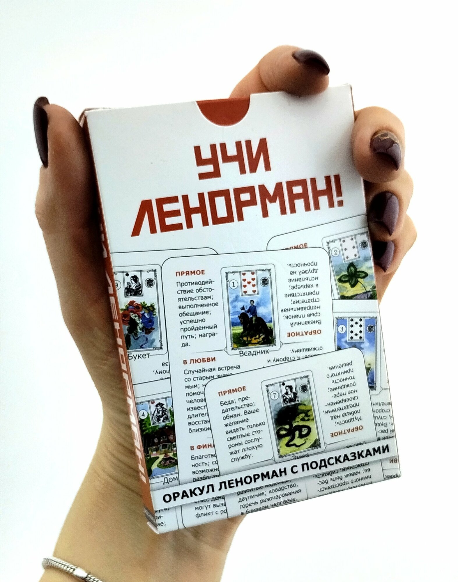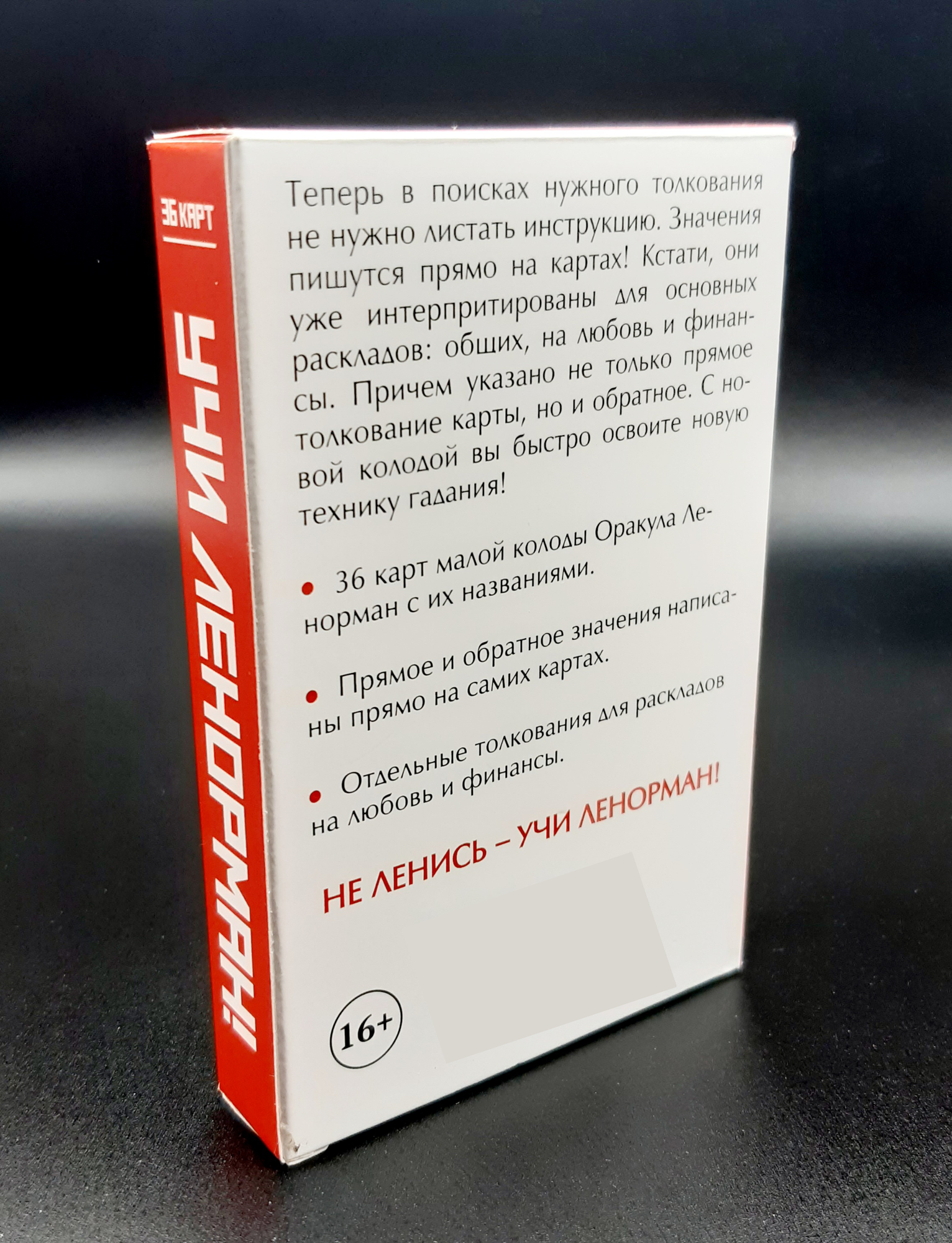 Колода для тех, кто давно мечтает научиться работать с оракулом Ленорман. Теперь в поисках нужного толкования не нужно листать инструкцию. Значение пишется прямо на картах! Кстати, оно уже интерпритировано для основных раскладов: общее, в любви и в финансах. Причем указано не только прямое толкование карты, но и перевернутое. С новой колодой вы быстро освоите новый инструмент гадания!