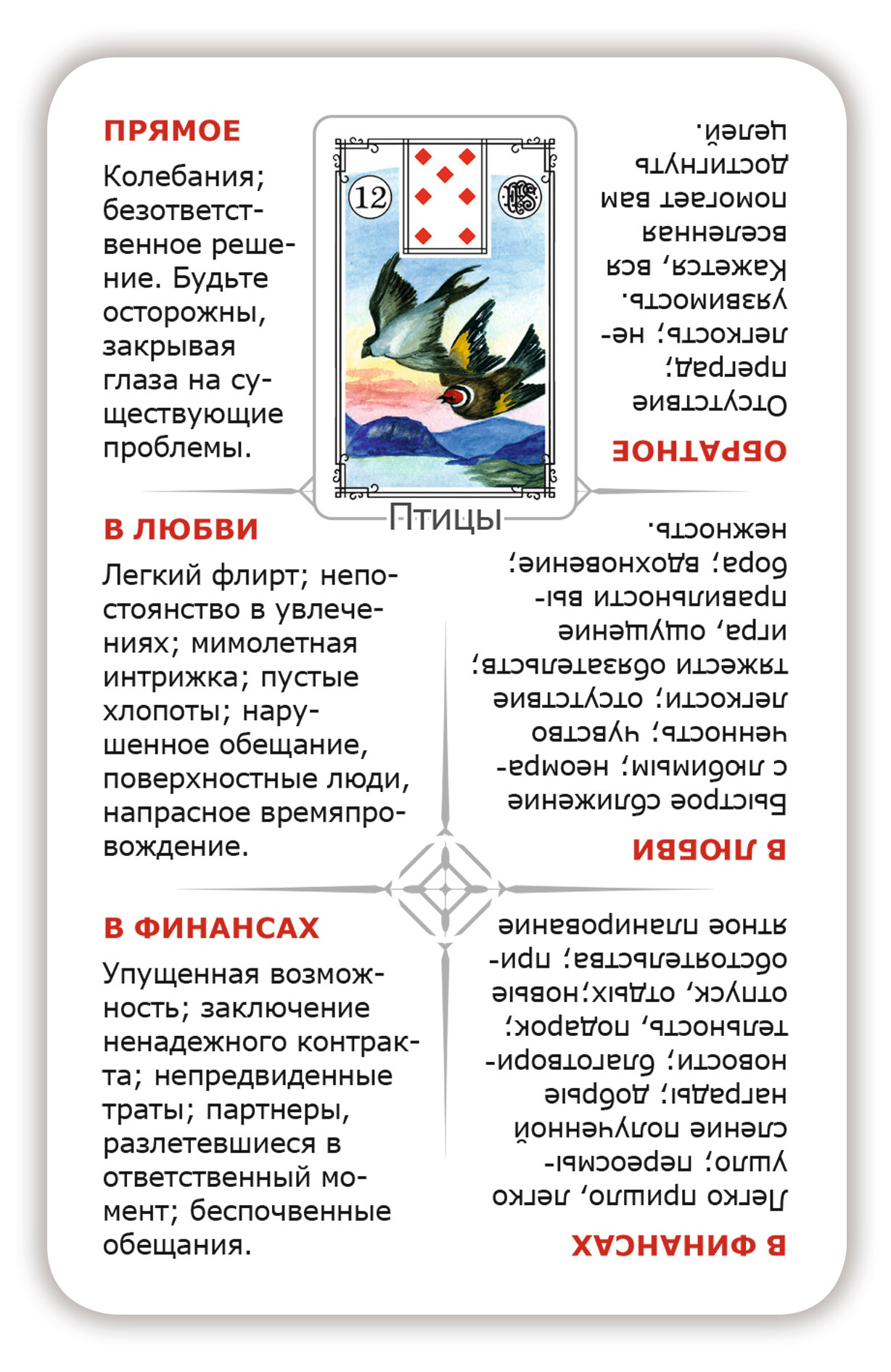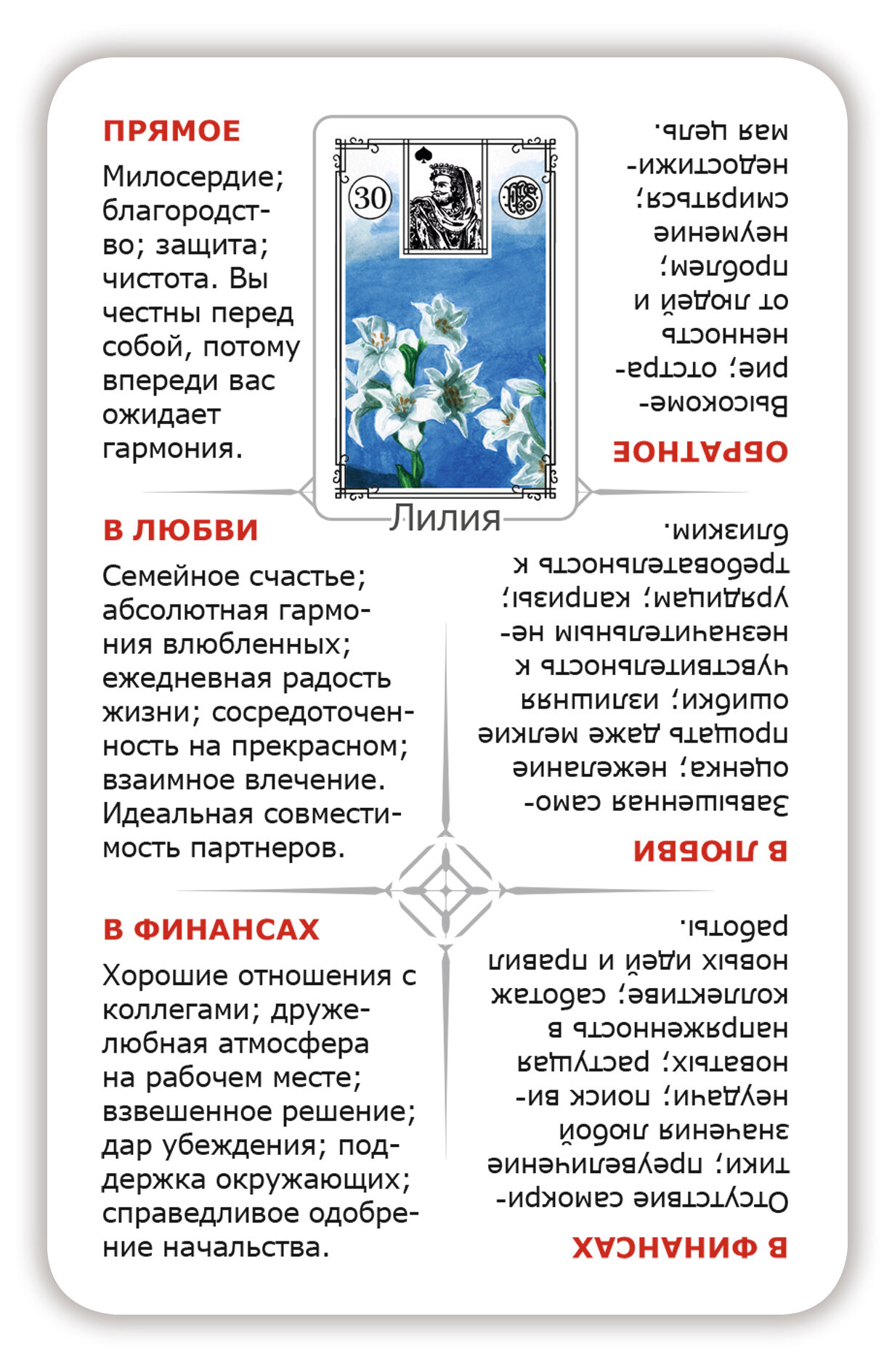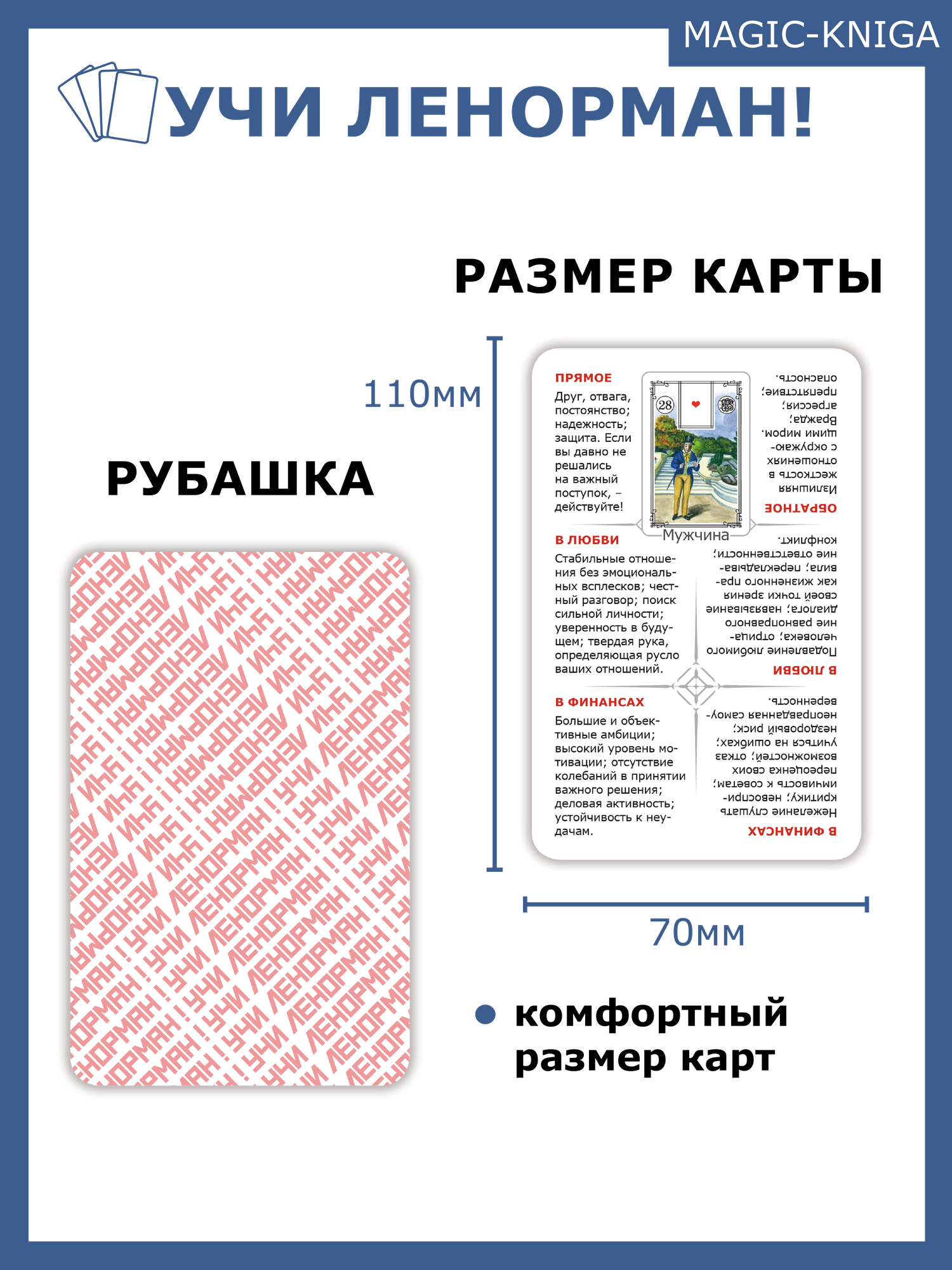 Колода для тех, кто давно мечтает научиться работать с оракулом Ленорман. Теперь в поисках нужного толкования не нужно листать инструкцию. Значение пишется прямо на картах! Кстати, оно уже интерпритировано для основных раскладов: общее, в любви и в финансах. Причем указано не только прямое толкование карты, но и перевернутое. С новой колодой вы быстро освоите новый инструмент гадания!