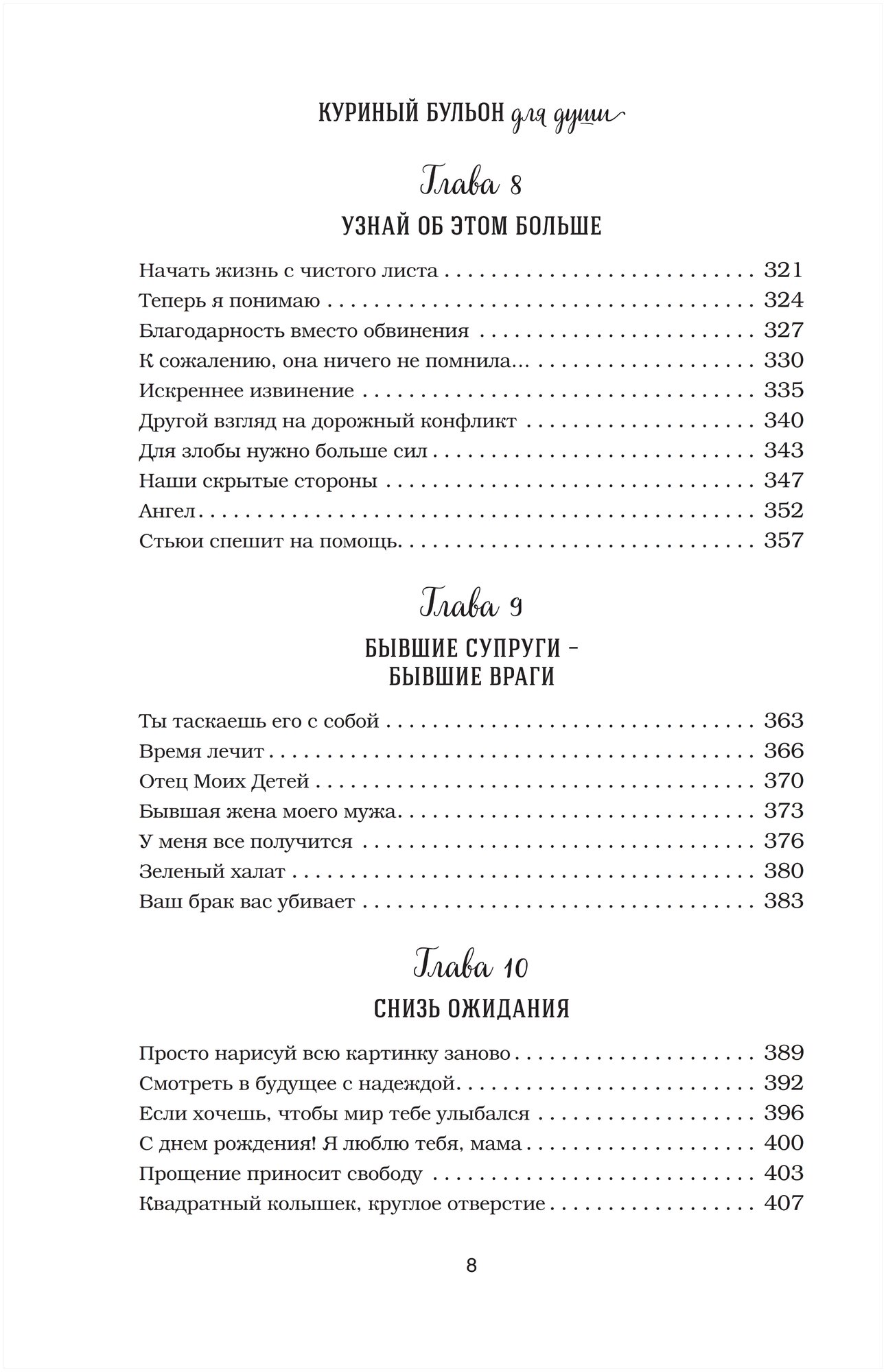Есть вся коллекция книг "Куриный бульон". Эта книга получилась какой-то особенной. Истории все разные, но между ними много общего. Глянцевая обложка отличается от всех остальных книг. Читается легко. Можно за раз прочитать одну, а можно и целую книгу. Цена радует на эту серию.