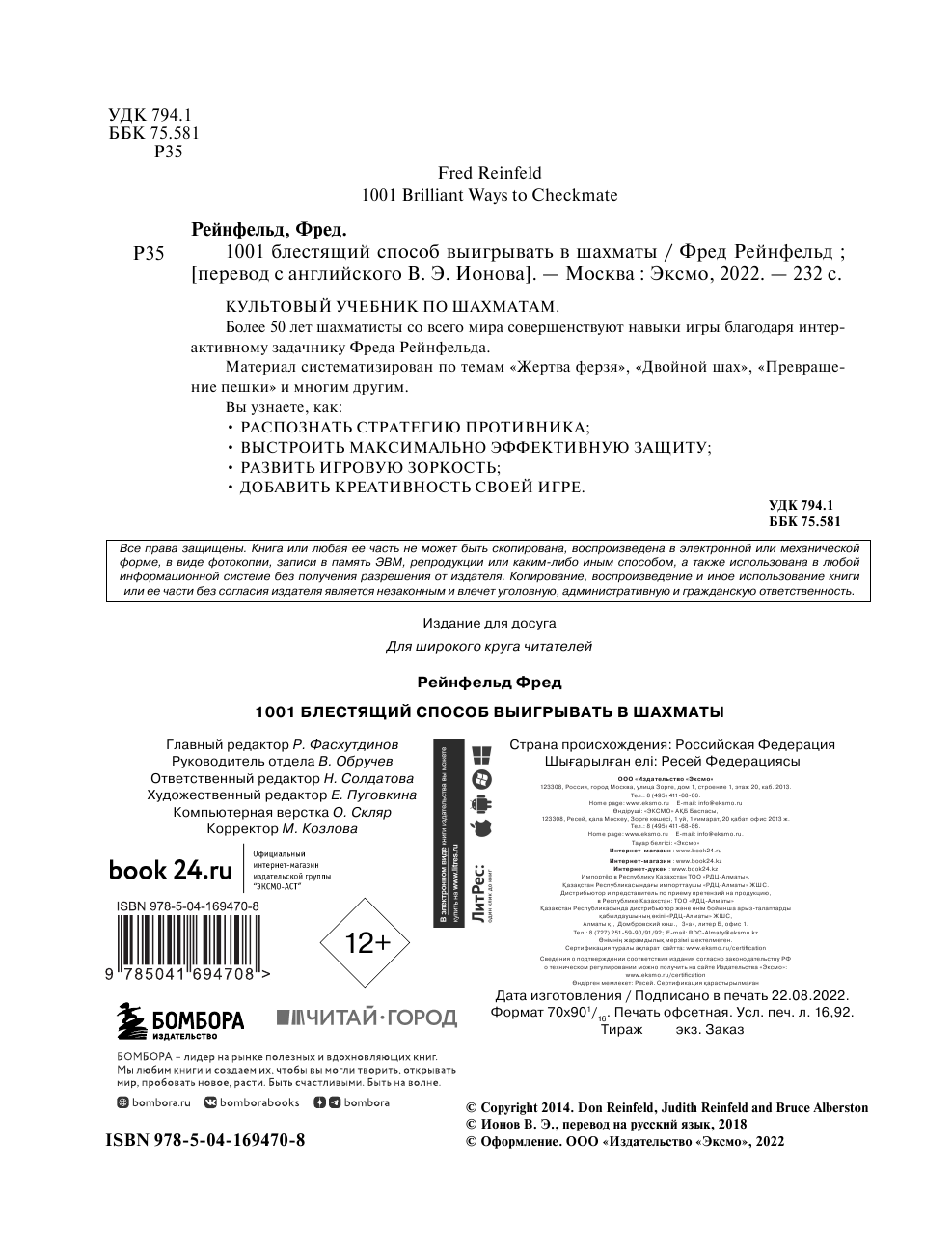 1001 блестящий способ выигрывать в шахматы (3-ое изд.) (Ионова В.Э. (переводчик), Рейнфельд Фред); Эксмо, 2022