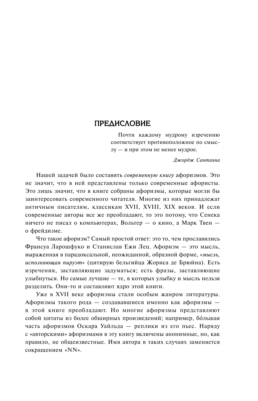 В этой книге собраны афоризмы, которые могли бы заинтересовать современного читателя. Многие из них принадлежат античным писателям, классикам XVII, XVIII, XIX веков. И если современные авторы все же преобладают, то это потому, что Сенека ничего не писал о компьютерах, Вольтер — о кино, а Марк Твен — о фрейдизме.
