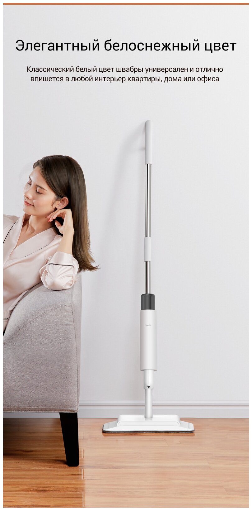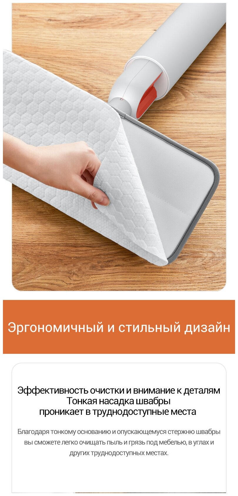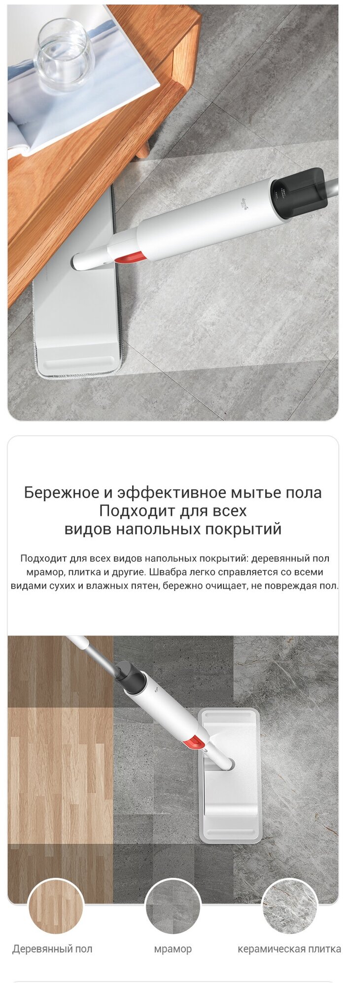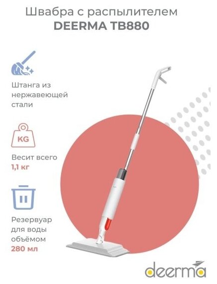 Благодаря встроенному бустерному распылительному насосу швабра Deerma TB880 значительно ускоряет и упрощает влажную уборку. Чтобы смочить тряпку, нужно лишь наполнить резервуар для воды и аккуратно нажать на ручку. Распыление начнется через 0,1 секунды. При каждом нажатии тончайшие водяные струи распыляются в форме полукруга на расстоянии до 110 см. Можно добавить дезинфицирующее средство в резервуар для воды, чтобы повысить эффективность уборки. Передняя механическая барабанная щетка вращается во время движения вперед, перенося грязь с пола в пылесборник. Мягкие и длинные волокна удаляют скопления пыли и грязи из самых труднодоступных мест. Ткань для швабры характеризуется трехслойной композитной структурой, состоящей из углеродного волокна, тонкого волокна и клеевого слоя. Насадка подходит для деревянных и мраморных полов, плитки, ламината, паркета и других покрытий. Легко справляется с сухими и влажными пятнами. Резервуар вмещает 280 мл воды. Такой объем позволяет единовременно убраться в помещении площадью до 100 м.