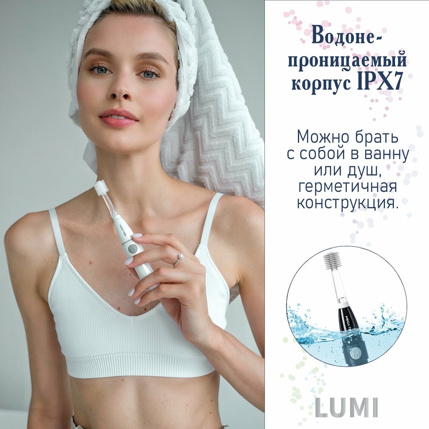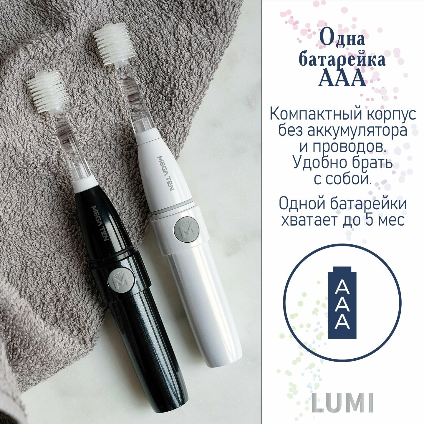 Люми MEGA TEN Lumi- инновационная электрическая зубная щетка из Южной Кореи с лаконичным дизайном для мужчин и женщин. Возраст 13 лет +. В комплекте идет защитный колпачок, который так же выполняет функцию удлинения ручки.Характеристики:1. Звуковая технология работы: 18 000 колебаний/мин.2. Цилиндрическая чистящая головка - запатентованная японская технология (технология не предполагает, чтобы насадка крутилась по кругу).3. 20 000 ультратонких мягких щетинок из премиального нейлона Dupont™ Tynex® добираются до труднодоступных мест во рту. Их в 15 раз больше, чем у обычной щётки, они в 2 раза эффективнее справляются с зубным налетом.4. LED подсветка позволяет качественно проверить чистоту зубов.5. Умный режим с 2х минутным таймером.6. Водонепроницаемый корпус IPX7 – возможность использования во время душа.7. Рекомендованы для использования при винирах, брекетах и других ортодонтических конструкциях.8. Рекомендованы для чувствительных зубов и дёсен, в том числе во время беременности.Замена насадки каждые 3 - 4 месяца.Есть все необходимые мировые сертификаты - ЕАС, FDA, CE, BPA-free.