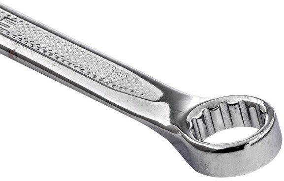 | Прочие особенности и свойства | Твердость 43-45 HRC. Ключ с одной стороны оснащен захватом открытого типа – рожковым и накидным (кольцевым) с другой стороны., Профиль кольцевого зева имеет 12 граней, что увеличивает площадь соприкосновения рабочих поверхностей и снижает риск деформации граней крепежа при монтаже., Угол наклона кольцевого зева относительно плоскости ключа в 15 градусов делает монтаж более удобным., Хромированное зеркальное покрытие ключа улучшает антикоррозийные свойства инструмента., Имеет специальную форму поверхности для более надежного удержания ключа в руке. |