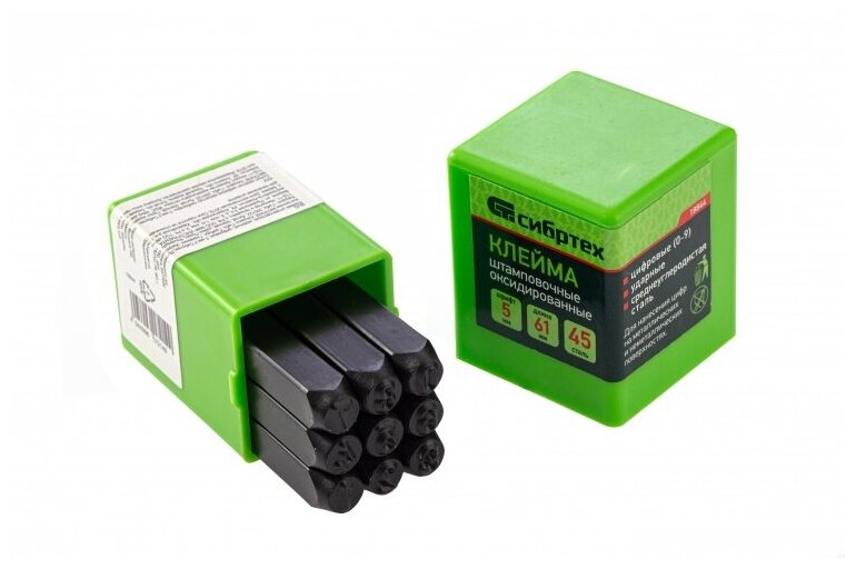 Штамповочные, ударные, цифровые клейма СИБРТЕХ 5 мм выполнены из прочной инструментальной стали. Комплект уложен в пластиковый короб для безопасного хранения.