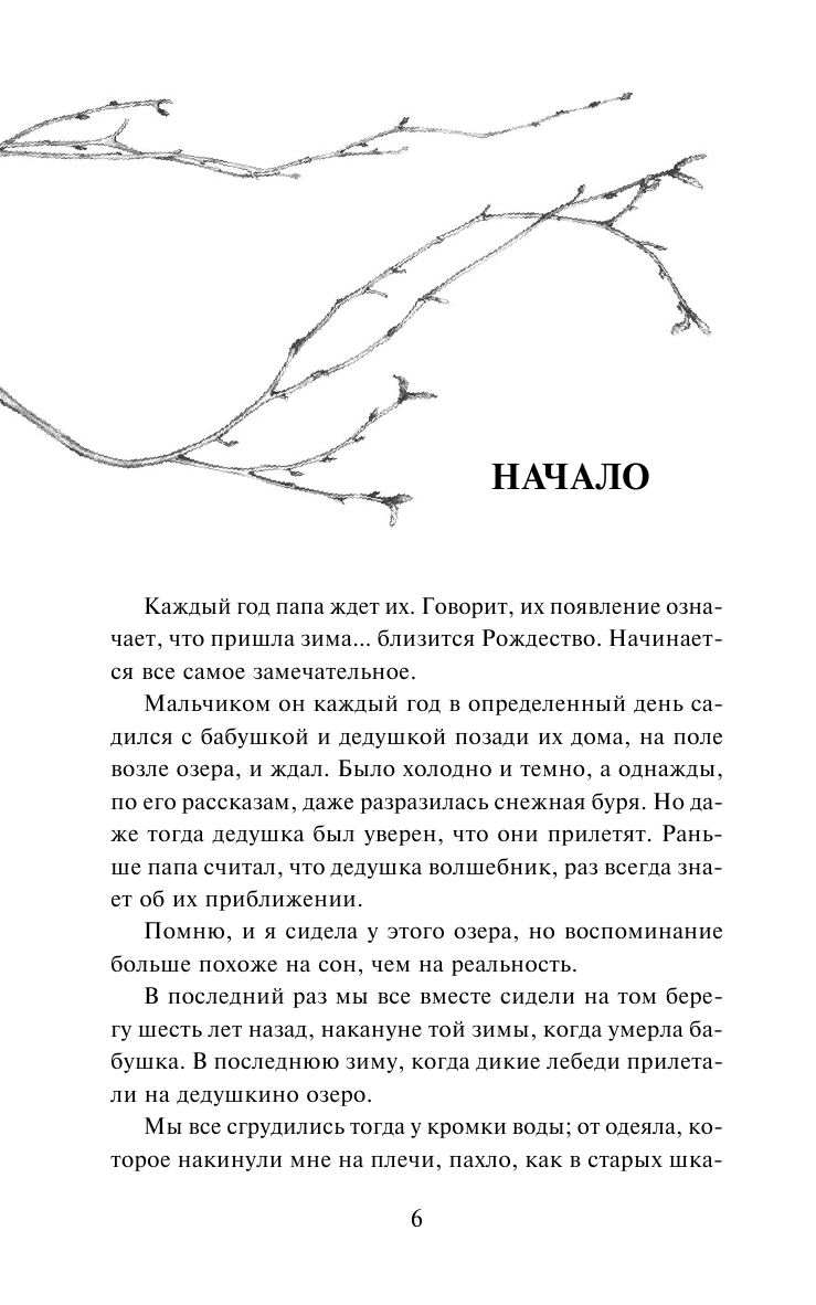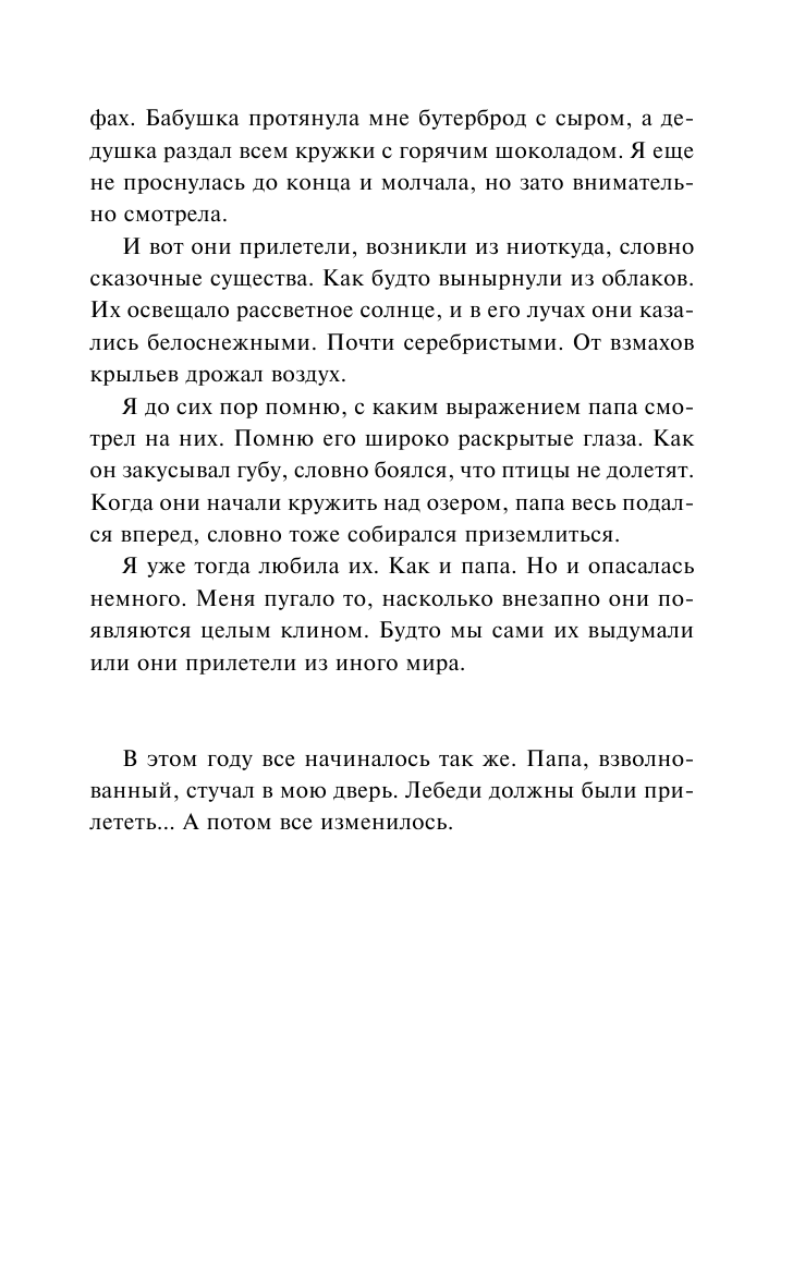 «И вот они прилетели, возникли из ниоткуда, словно сказочные существа. Как будто вынырнули из облаков. Их освещало рассветное солнце, и в его лучах они казались белоснежными. Почти серебристыми. От взмахов крыльев дрожал воздух».