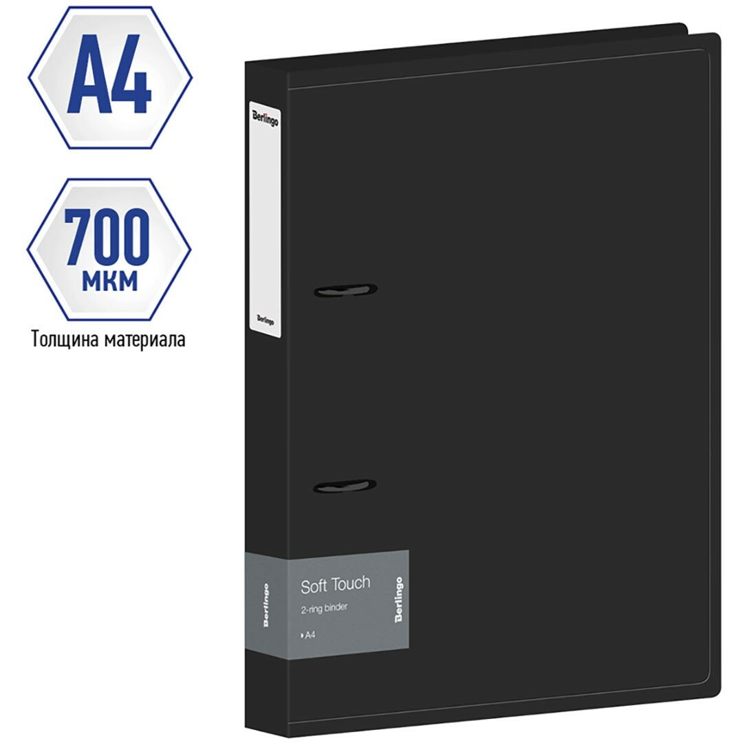 Папка на 2-х D-кольцах Berlingo серии Soft Touch формата А4 - стильный аксессуар для офиса и учёбы с плотной обложкой с приятной софт-тач фактурой. Изготовлена из высококачественного полипропилена толщиной 700 мкм с особой фактурой с эффектом софт-тач. Увеличенная ширина корешка 40 мм, что позволяет хранить до 250 листов. Ширина папки составляет 250мм. Папка оснащена стильными черными кольцами, которые крепятся на заднюю стенку. Специальная D-форма колец диаметром 20 мм помогает удобно и ровно хранить документы, которые могут быть выровнены по левому краю, благодаря боковой вертикальной стенке кольца. Вместимость папки - 250 листов. Специальные формовые отверстия в обложке служат для надежного защелкивания папки в сложенном виде, предотвращают случайное открытие обложки и замятие документов внутри при хранении и транспортировке. На внутренней стороне обложки папка оснащена плотным прозрачным карманом для удобного хранения мелочей: ручки, заметок, визиток, дисков, флешек и др. Корешок папки оклеен специальным стикером для подписи содержимого, что позволяет легко и удобно организовывать документы на полке. Дополнительный стикер в комплекте. Размер папки составляет 310х250х40 мм. Упакована в индивидуальный прозрачный пакет по форме. Папка оснащена съемным стикером с выходной информацией и штрих-кодом.