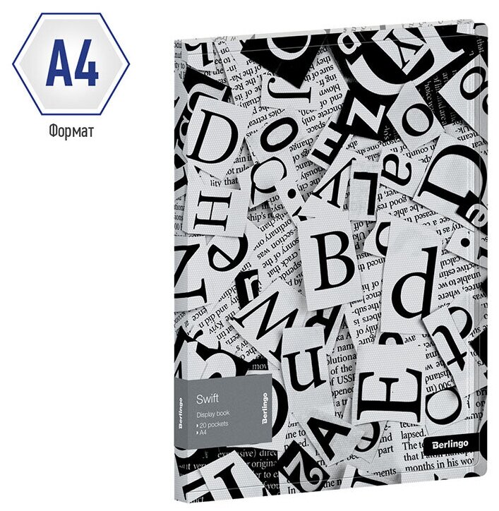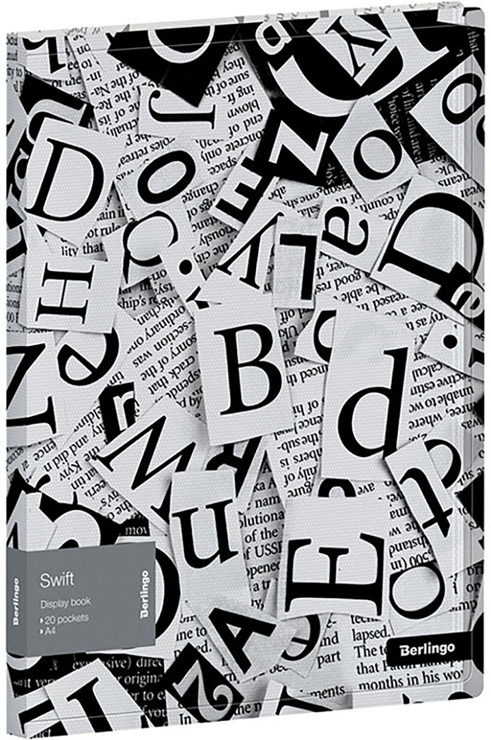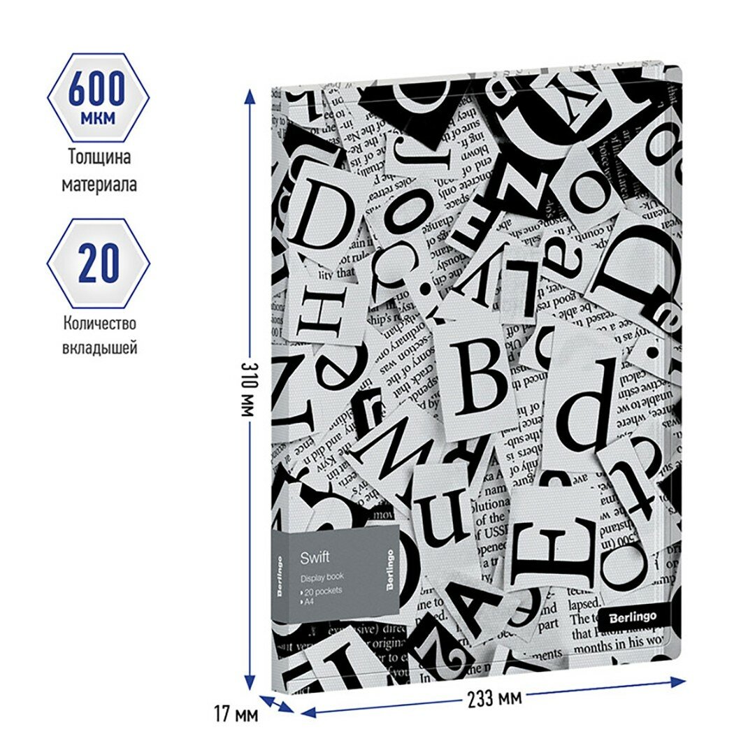 Папка Berlingo Swift формата А4 содержит 20 вкладышей, которые надёжно защищают листы от повреждений. Листы-карманы увеличенной толщины 30мкм надежно скреплены сваркой. Размер изделия: 310х233х17 мм, ширина корешка: 17 мм, толщина материала: 600 мкм. Изготовлена из высококачественного полипропилена с матовой текстурой поверхности "песок", на которой не видно отпечатков пальцев и мелких царапин. На внутренней стороне обложки оснащена плотным прозрачным карманом для удобного хранения мелочей: ручки, заметок, визиток, дисков, флешек и др. Папка вмещает до 100 бумажных листов. Упакована в индивидуальный прозрачный пакет