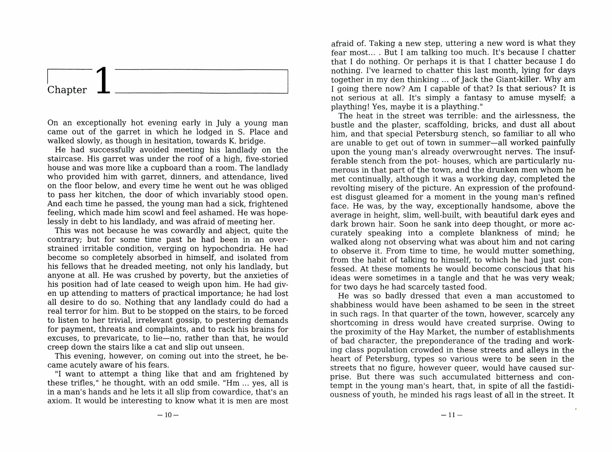 Crime and Punishment is social-psychological and social-philosophical novel. It focuses on moral dilemmas of Rodion Raskolnikov, an impoverished ex-student in Saint Petersburg who formulates and executes a plan to kill an unprincipled pawnbroker for her cash. He commits the murder to test a theory of his that dictates some people are naturally capable of such actions, and even have the right to perform them. It portrays a large cast of other characters and offers the reader many literary, philosophical, and autobiographical digressions, often in a highly satirical vein.
