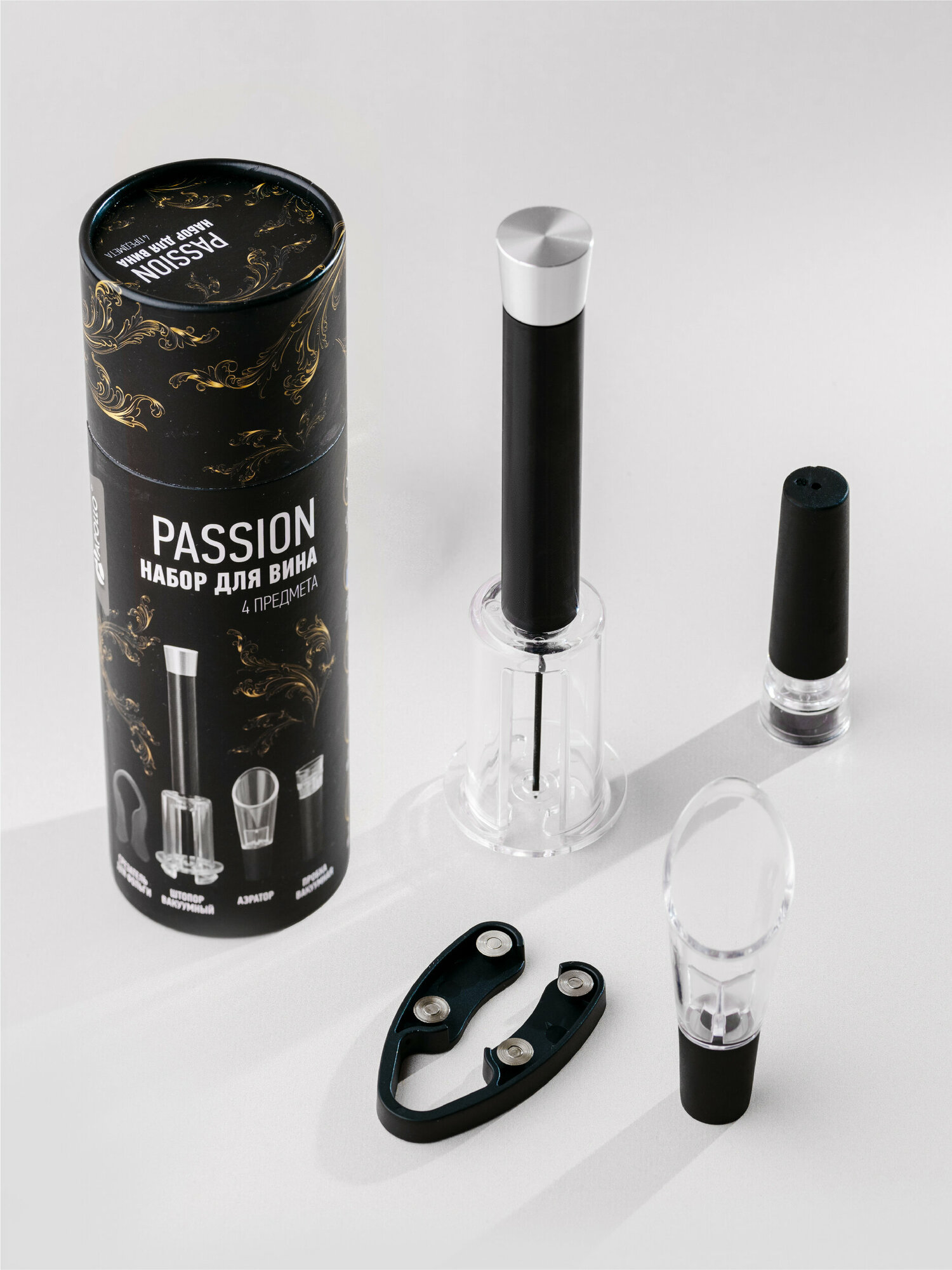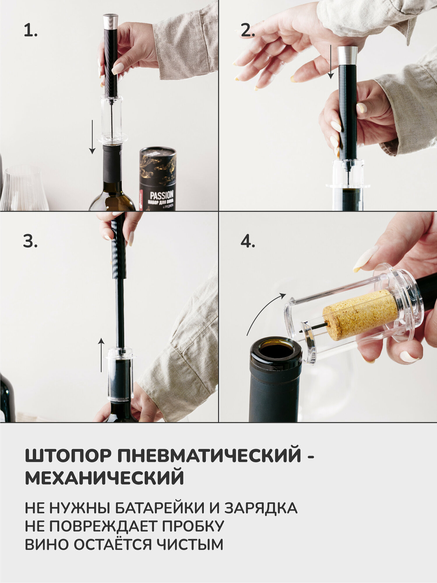 В комплекте: пневматический штопор, резак для фольги, аэратор и вакуумная пробка;Материал изготовления: силикон, пластик акрил; Рекомендации по уходу: рекомендуется ручная мойка с использованием щадящих моющих средств;Набор сомелье для вина включает 4 предмета, представленных в стильной подарочной упаковке. Пневматический штопор в наборе извлекает пробку из бутылки, не повреждая ее. Это происходит благодаря применению силы давления воздуха, что делает процесс откупоривания легким и бережным.Резак для фольги помогает быстро и аккуратно удалять этикетки и другие упаковочные материалы с бутылок.Аэратор обогатит вино кислородом, усиливая его вкус и аромат. Этот аксессуар также помогает аккуратно разлить вино.Вакуумная пробка, выполненная из прочного акрила и качественного силикона, сохраняет аромат и вкус вина в открытой бутылке. Ее встроенный поршень позволяет удалить воздух, что обеспечивает дополнительную защиту от посторонних запахов и примесей при длительном хранении.Набор для вина также отличается стильным и компактным дизайном, а его материалы изготовления обеспечивают долговечность и надежность.Современные аксессуары для вина из этого набора добавят особое волшебство в ваш опыт ужина и легко можно взять с собой на пикник.