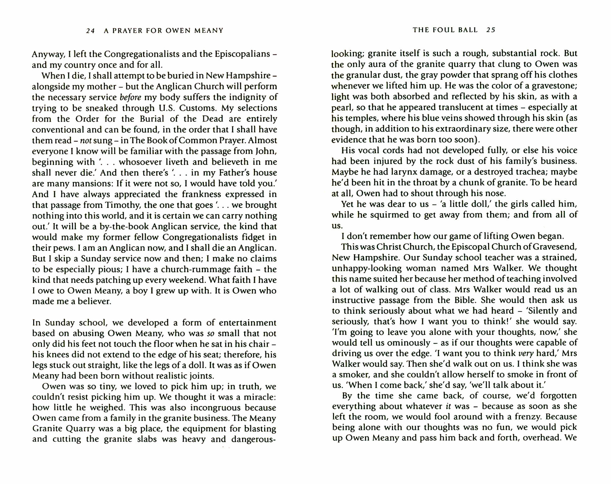 Eleven-year-old Owen Meany, playing in a Little League baseball game in Gravesend, New Hampshire, hits a foul ball and kills his best friend's mother.