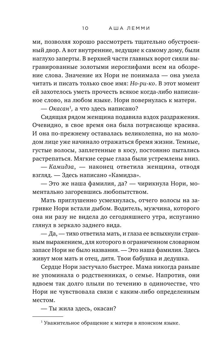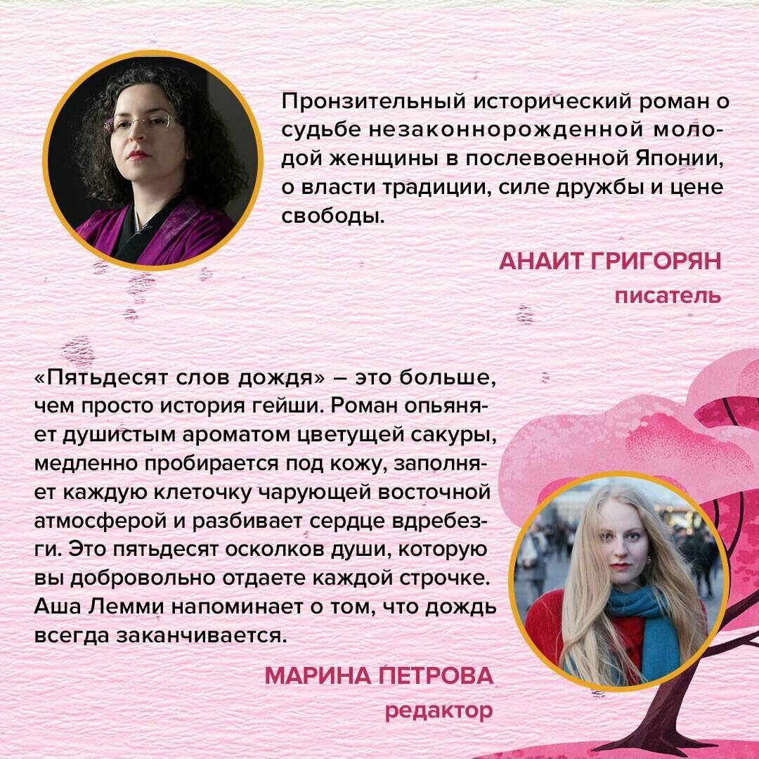 «Пятьдесят слов дождя» – это больше, чем просто история гейши. Роман опьяняет душистым ароматом цветущей сакуры, медленно пробирается под кожу, заполняет каждую клеточку чарующей восточной атмосферой и разбивает сердце вдребезги. Это пятьдесят осколков души, которую вы добровольно отдаете каждой строчке. Аша Лемми напоминает о том, что дождь всегда заканчивается. -