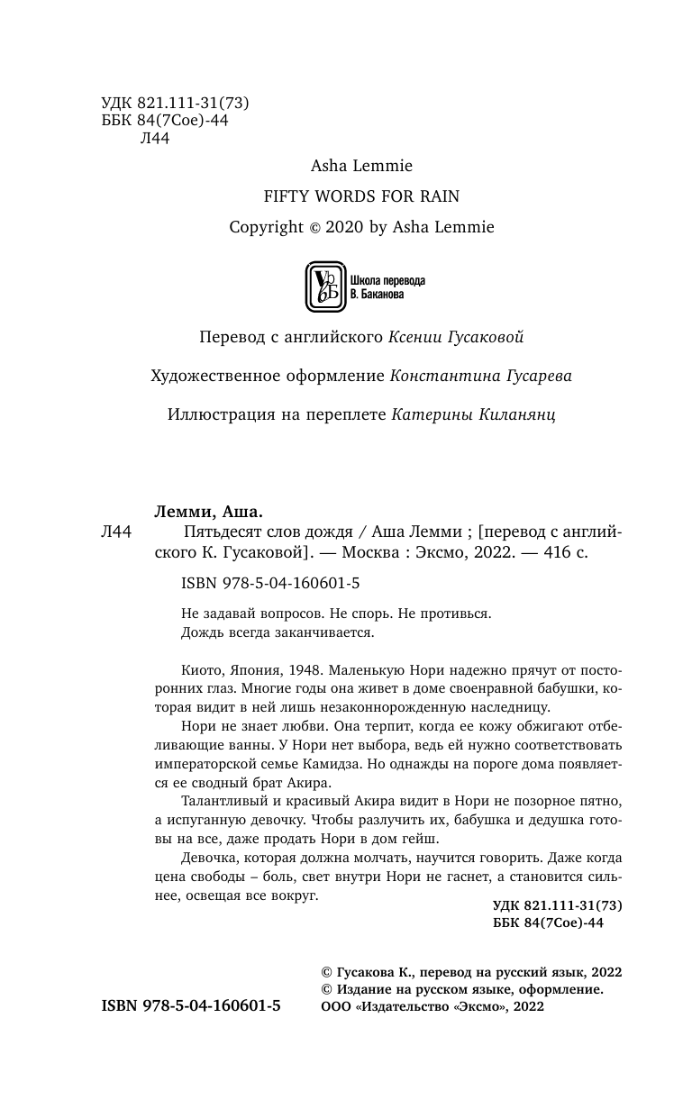 Книга: Пятьдесят слов дождя (Аша Лемми); Эксмо, Inspiria, Редакция 1, 2022