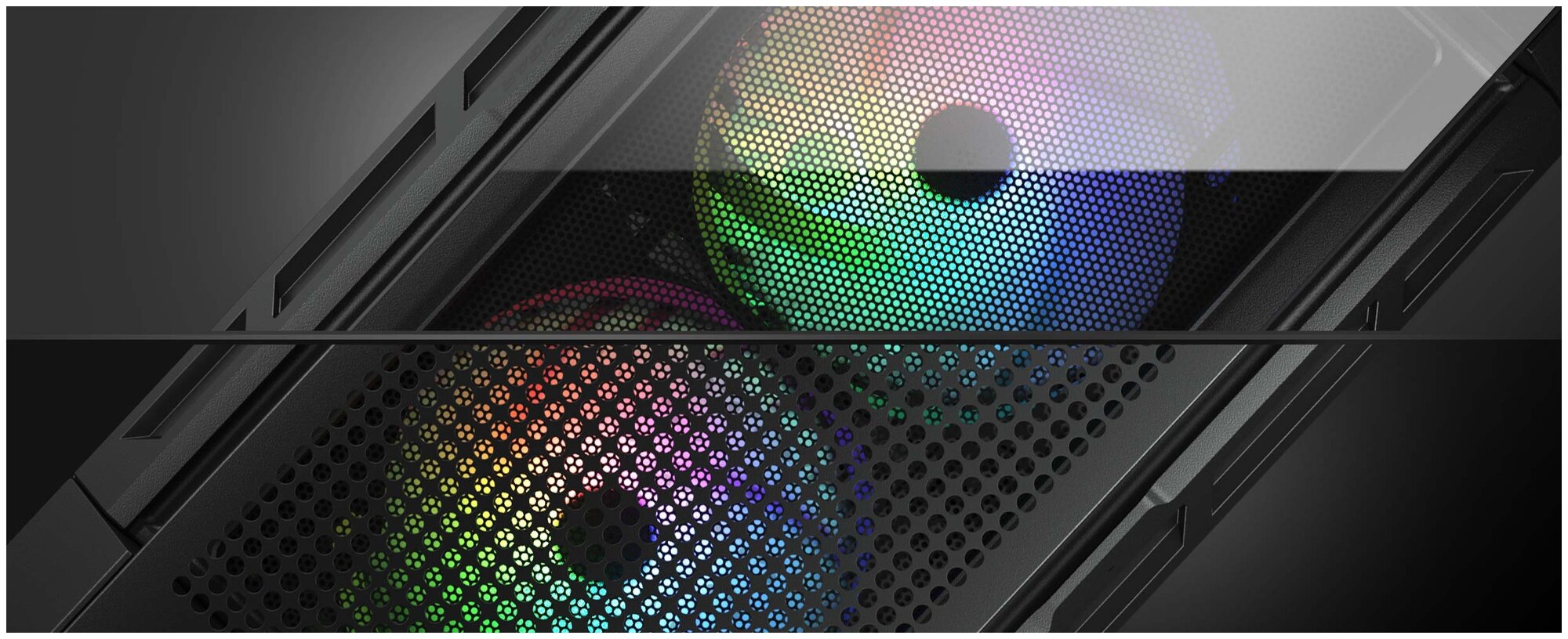 Устройство предлагается с двумя фронтальными панелями — стеклянной и сетчатой. В первом случае обеспечивается прекрасная видимость вентиляторов с многоцветной подсветкой, во втором — улучшенная вентиляция.