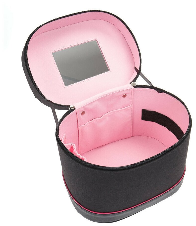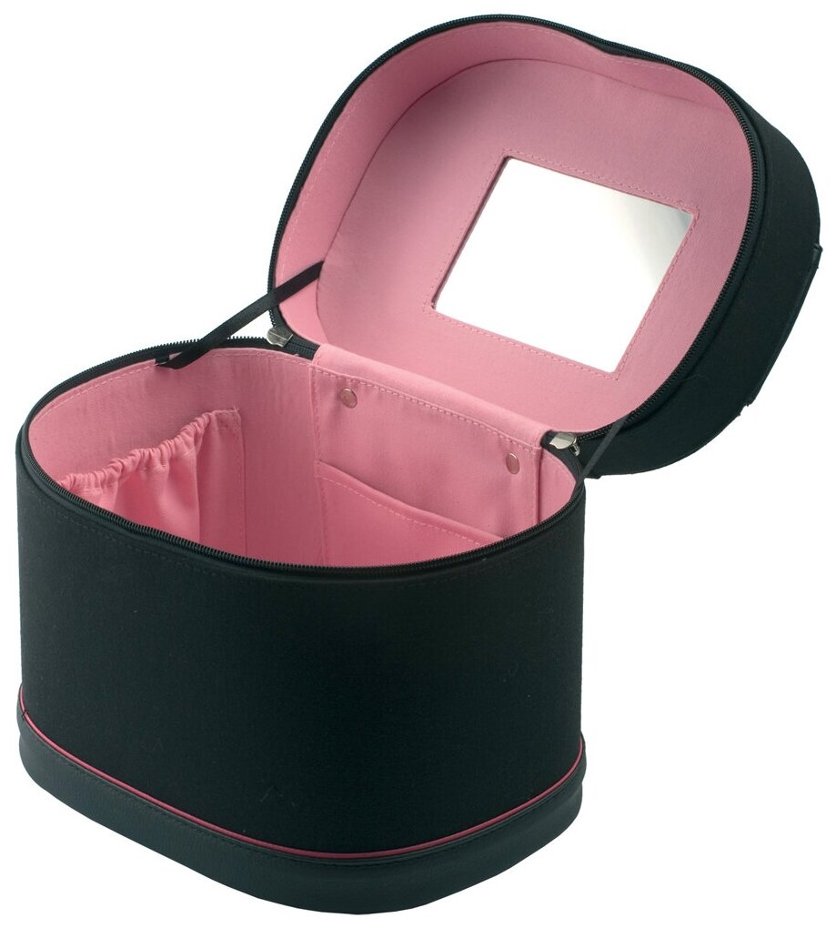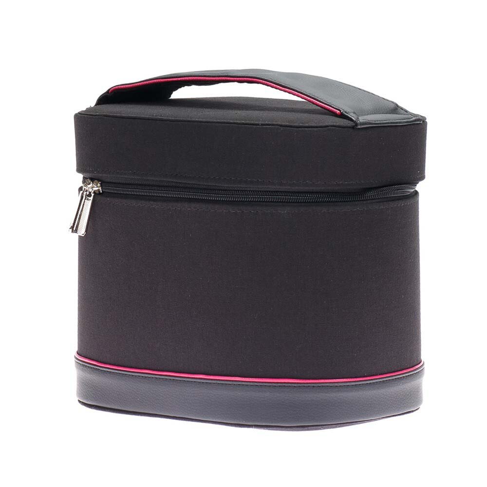 Портативная сумка для парикмахерских инструментов DEWAL имеет удобную форму вертикального бокса с крышкой на двусторонней молнии. Основной цвет изделия – чёрный с розовой отделкой. Внутри сумки расположены небольшие карманы для аксессуаров, на крышке имеются фиксаторы и встроенное зеркало. Внутреннее отделение выполнено из ткани розового цвета. Молния с двумя бегунками позволяет полностью открыть верхнюю часть бокса с любой стороны. Жёсткий каркас из полимерного материала высокого качества предохранит содержимое от деформации и попадания влаги. Изделие имеет компактный размер. В путешествиях сумка удобно подходит как для ручной клади, так и для транспортировки в чемодане.