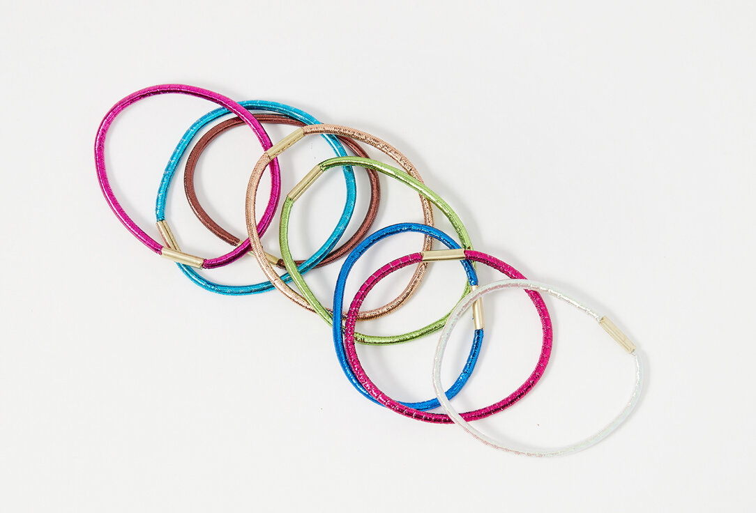 Материал изделий не боится влаги, даже при использовании в бассейне резинка не потеряет своих свойств. Блестящая оплётка резинок создаст праздничное настроение и подчеркнёт вашу индивидуальность. Экономичное предложение и выгодная комплектация набора,из восьми разноцветных резинок, позволит подобрать необходимые для разнообразных причёсок на каждый день.