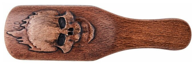 Изготовлена из дерева и щетины кабана. Окрашена в темный цвет и украшена оригинальным рельефным изображением черепа.