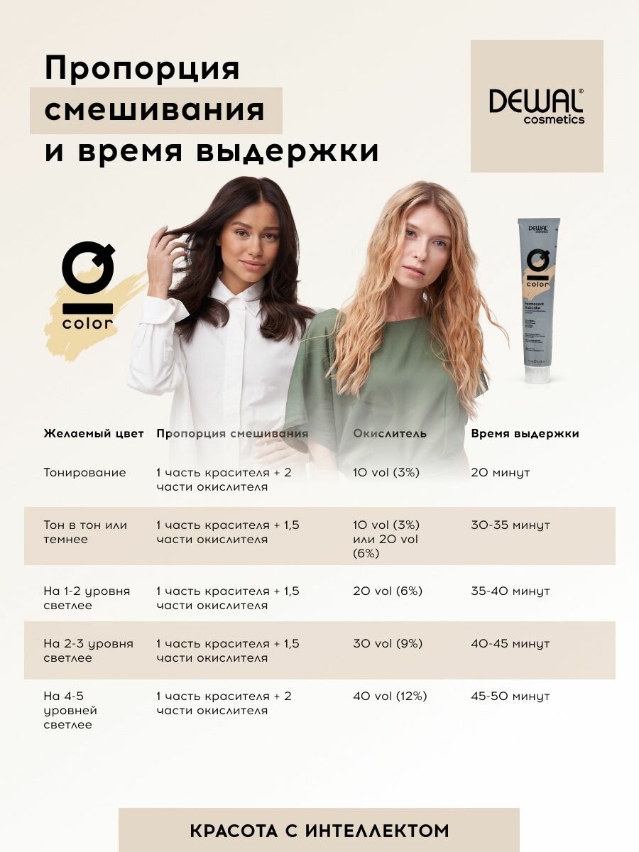 Пропорция смешивания окислителя с красителем IQ COLOR? 1:1.5 или 1:2 в зависимости от используемой серии оттенков. Пропорция смешивания окислителя с обесцвечивающими продуктами IQ COLOR BLO ND 1:2, в зависимости от желаемой техники обесцвечивания и консистенции смеси.
