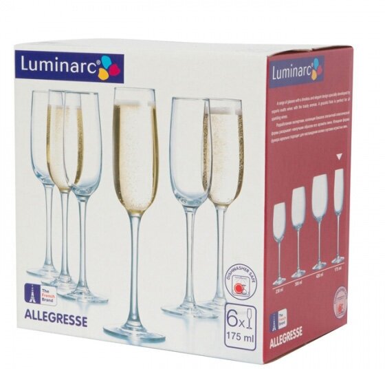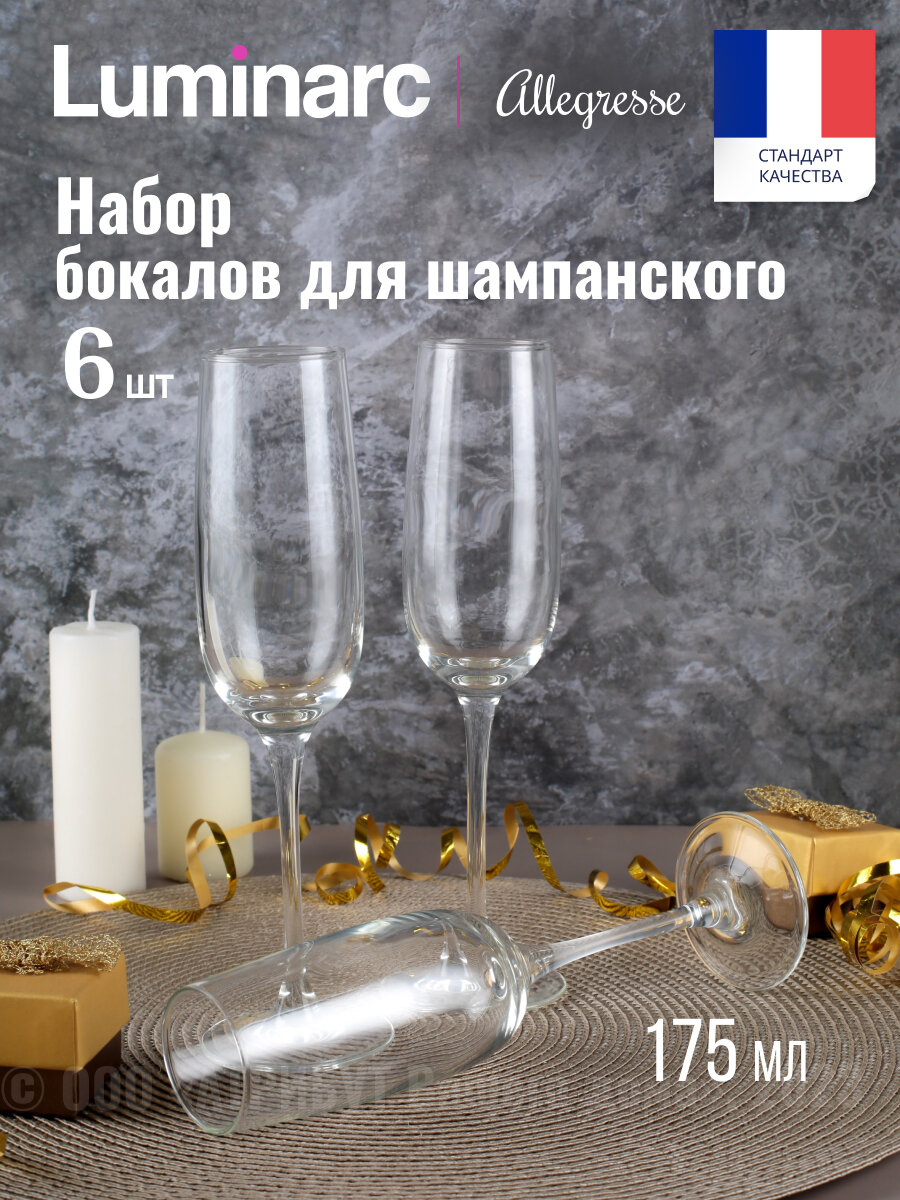 Бокалы для шампанского Luminarc Allegresse 175 мл — набор из 6 изящных флюте для стильной сервировки, подарка и ежедневного использования. Прозрачное стекло, идеально для дома и праздников.