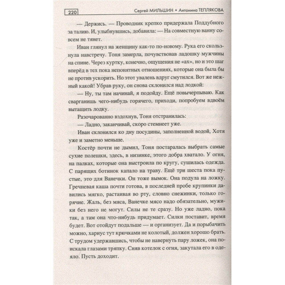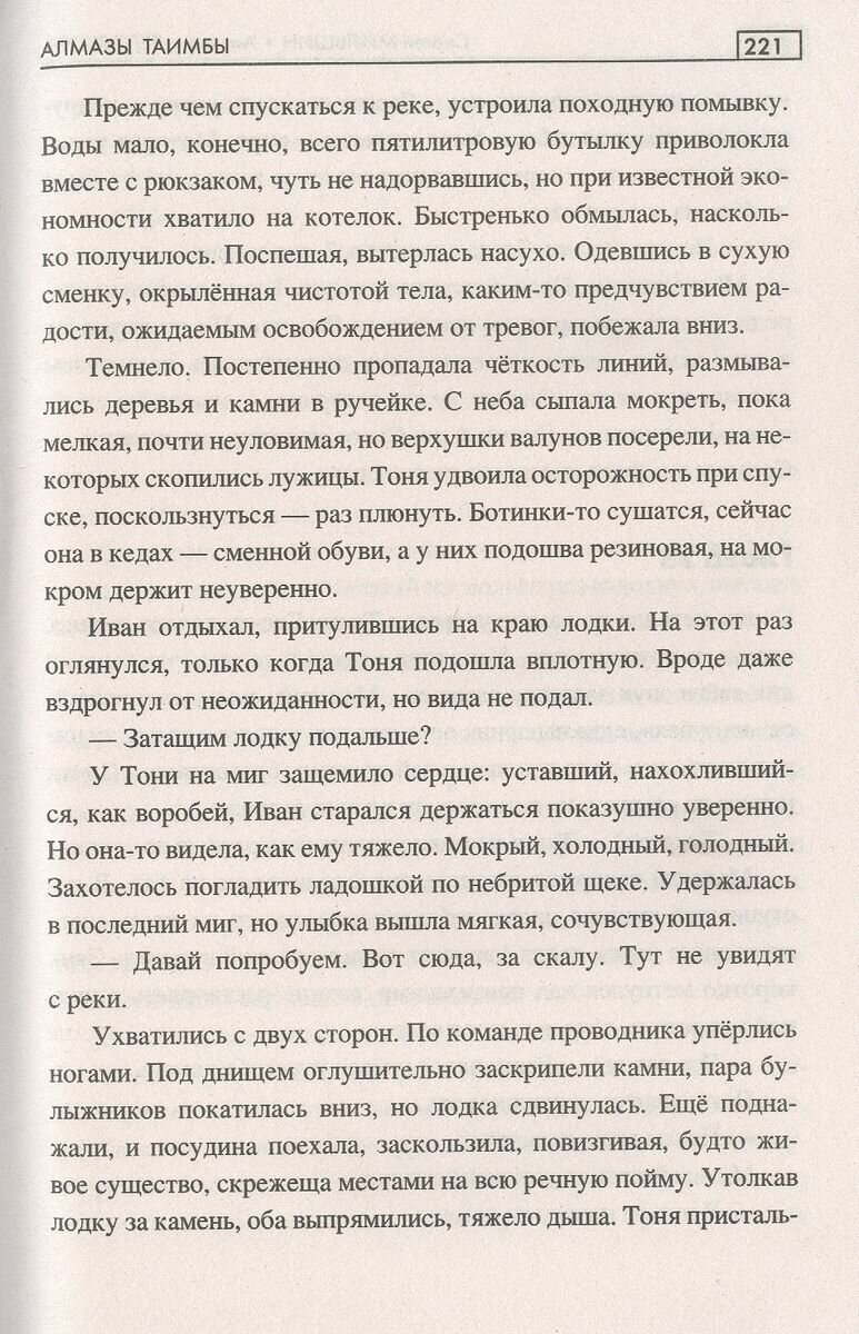 Мне книга очень нравится - неторопливое такое, но увлекательное повествование, которое, течёт, словно сибирская речушка Таимба. Очень хорошо передана таёжная атмосфера, при этом текст не перегружен описаниями. Всего в меру тут - и романтики, и приключений, и опасностей. Какие-то моменты ожидаемы, да и авторы на них заранее намекают, но очарование от этого не утрачивается. Язык книги замечательный - не приторный, не упрощённый. Герои не картонные, живые. Без детального описания внешности ты их всё равно видишь и "предельно ясно" представляешь :)