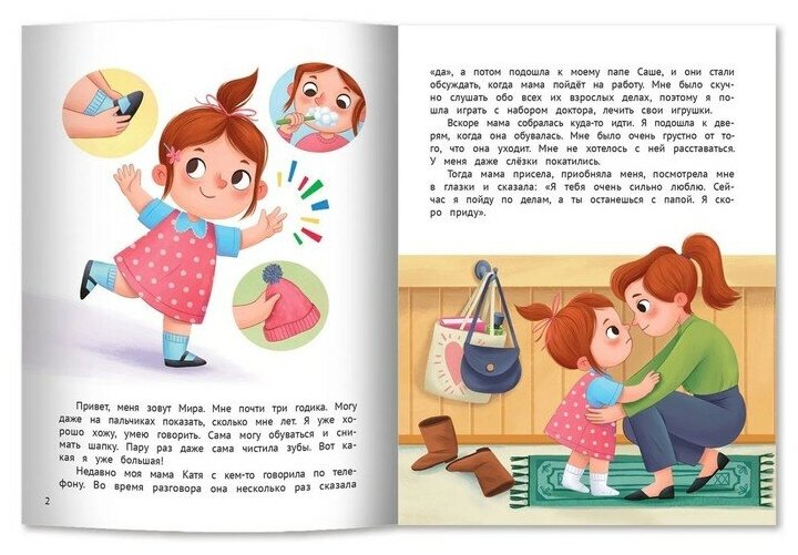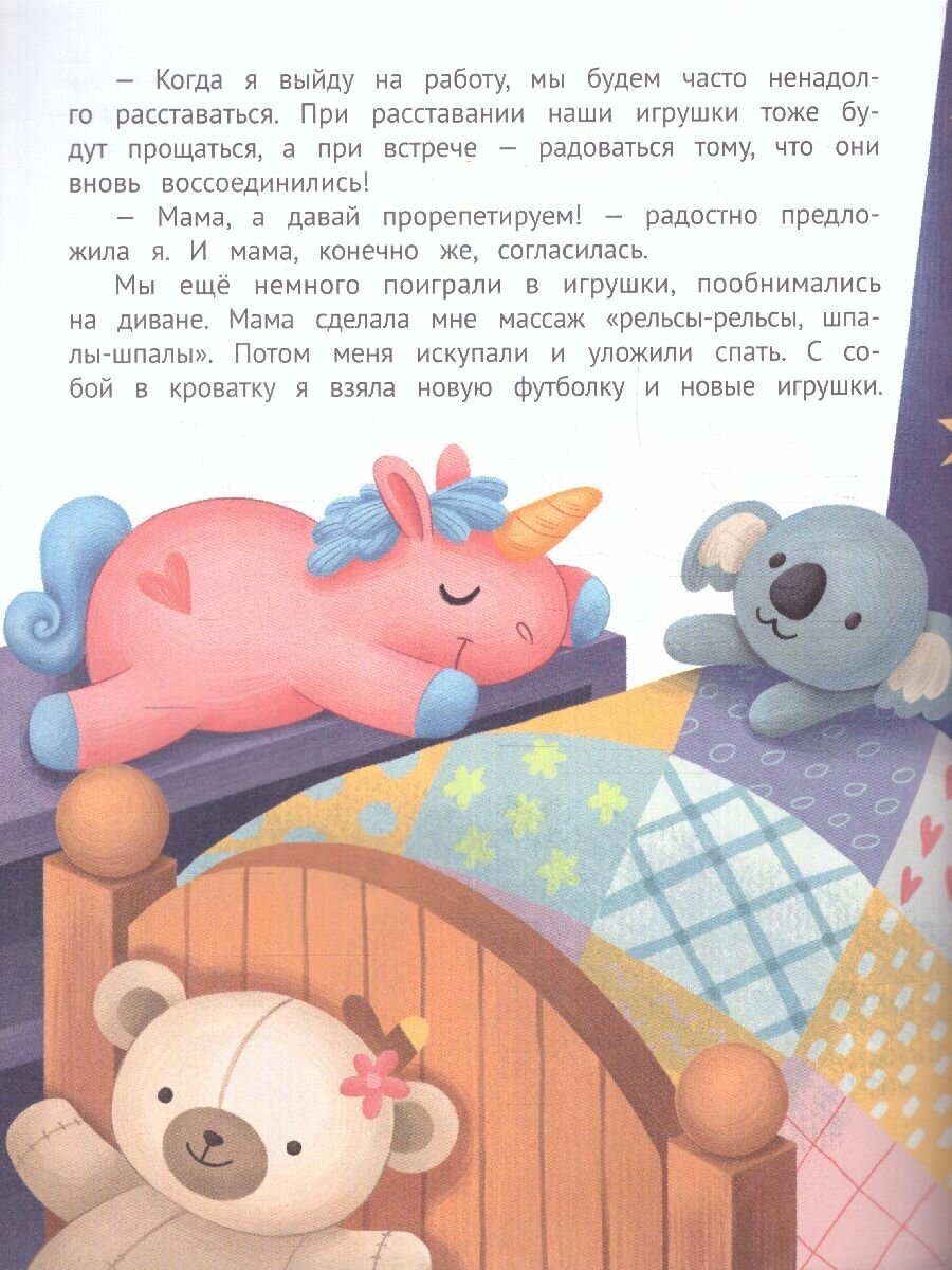 Прочитала эту книгу сыну. Сыну 3 год, в середине октября пошёл в сад. Во многих моментах по ходу чтения, ребёнок узнал себя. Некоторые моменты из книги я взяла для себя на вооружение. И благодаря книге, проговорила ещё раз сыну, что я его люблю, что я скучаю, что скучать это нормально и что я обязательно вечером приеду (ребёнка забирает из сада бабушка/дедушка). Спасибо за книгу!