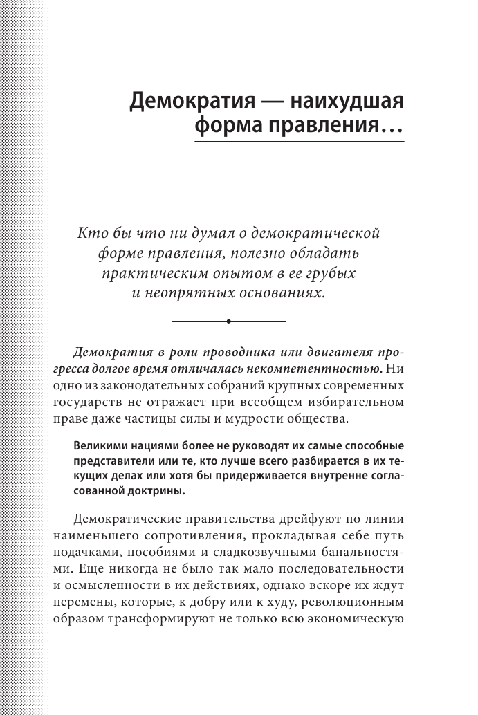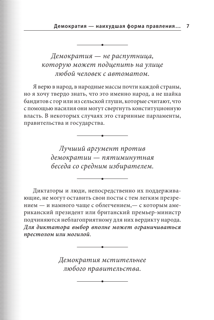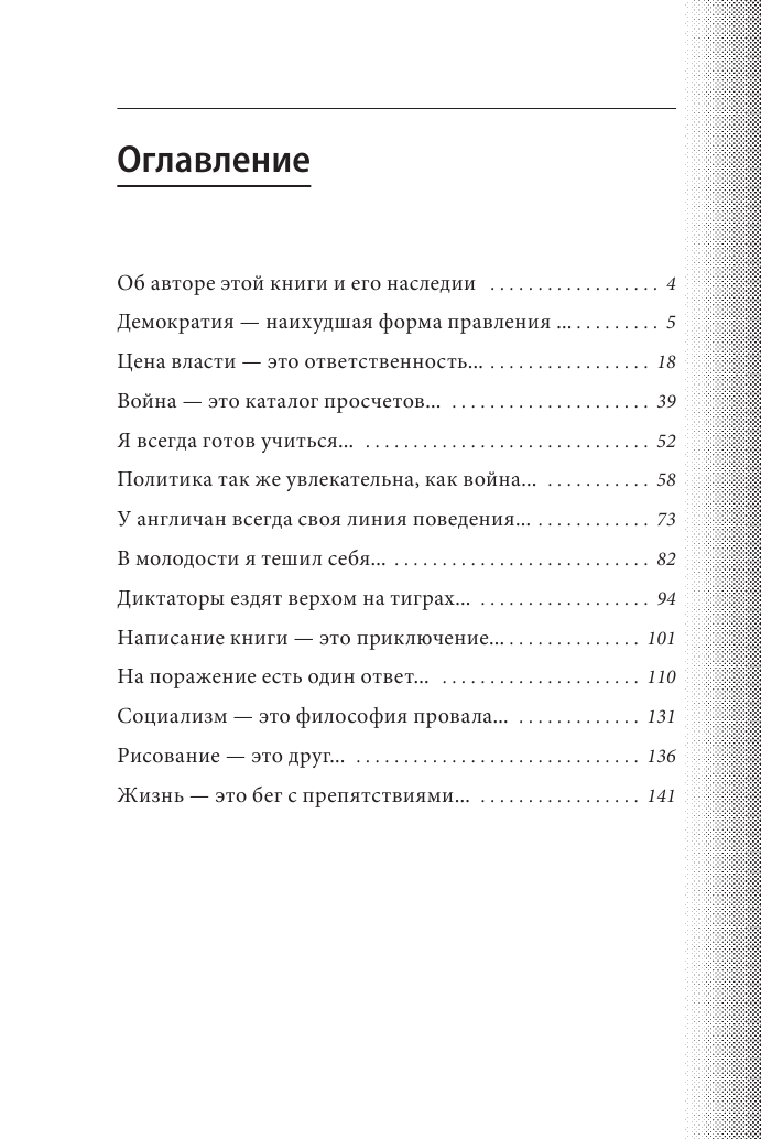 Обычно когда я брала в руки какой-нибудь очередной толстенный сборник очерков или воспоминаний Уинстона Черчиля, возникала чуть ли не паника, что это минимум на месяц чтения с учётом нехватки времени. Но эта маленькая книжка, больше похожая на шпаргалку, вернула желание прикоснуться (пусть и в виде отрывков и афоризмов) к наследию великого и талантливого англичанина. Спасибо издателям!