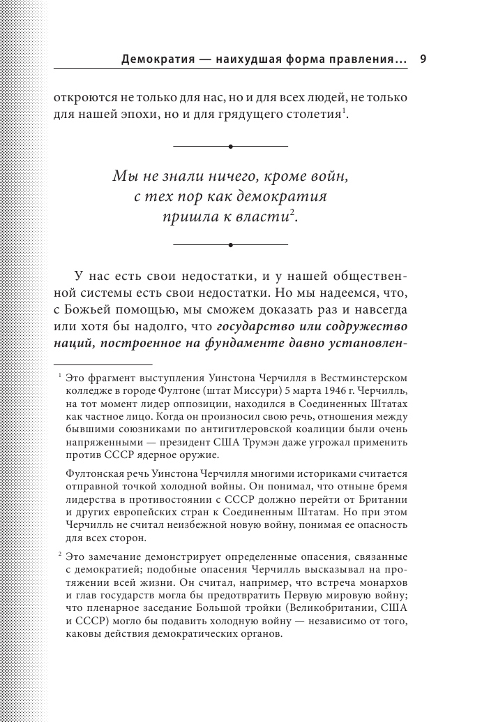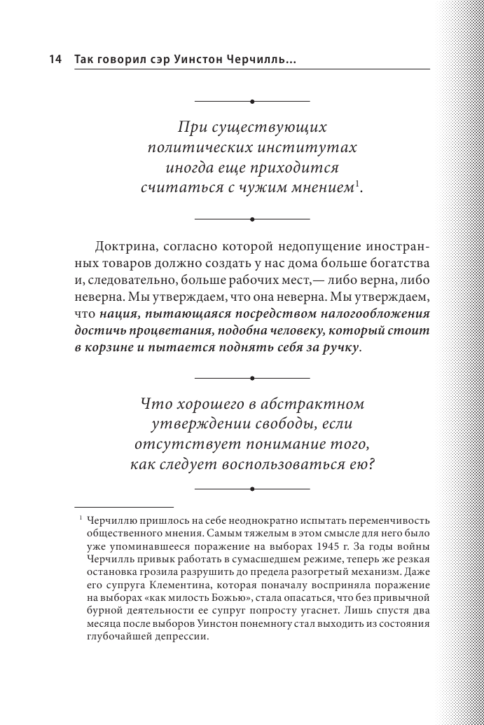 Книгу купила из любопытства, и она меня, надо сказать, не разочаровала. Удобный формат , интересно подобранный материал, не такие уж и тонкие страницы.Не газетная бумага,что тоже приятно. Данное издание идеально для поездок, в сумочке помещается без проблем.По содержанию- отлично.Узнала много новых изречений,обратила внимание на известные фразы, даже не подозревала, что они принадлежат Черчиллю .Рекомендую.