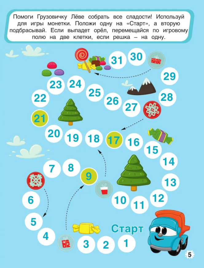 Для маленьких поклонников мультика про грузовичок Леву неплохой вариант. Формат книги достаточно большой, страницы очень плотные, картинки насыщенных ярких цветов. Множество заданий, однако большинство из них - открытка к новому году своими руками. С одной стороны это хорошо, но в то же время от книги ожидала большего разнообразия, например поделки для украшения дома к новому году.
