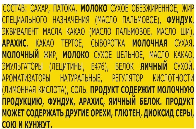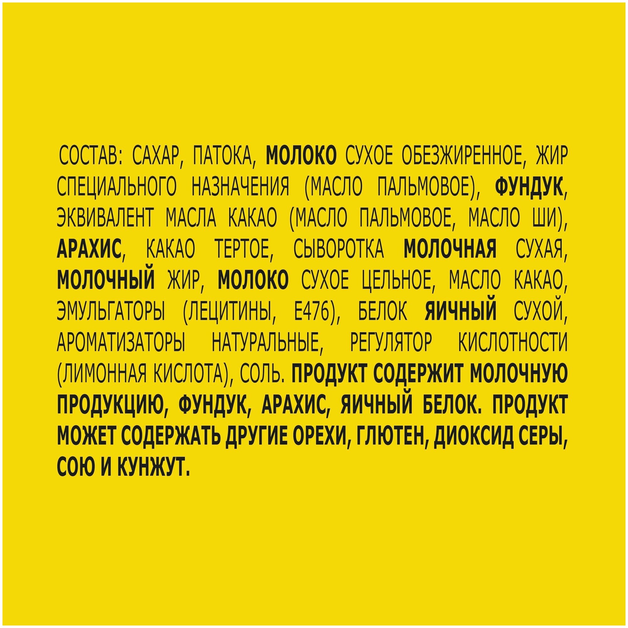 | Состав | сахар, патока, молоко сухое обезжиренное, жир специального назначения (масло пальмовое), фундук, эквивалент масла какао (масло пальмовое, масло ши), арахис, какао тертое, сыворотка молочная сухая, молочный жир, молоко сухое цельное, масло какао, эмульгаторы (лецитины, Е476), белок яичный сухой, ароматизаторы натуральные, регулятор кислотности (лимонная кислота), соль. Продукт может содержать другие орехи, глютен, диоксид серы, сою и кунжут. |