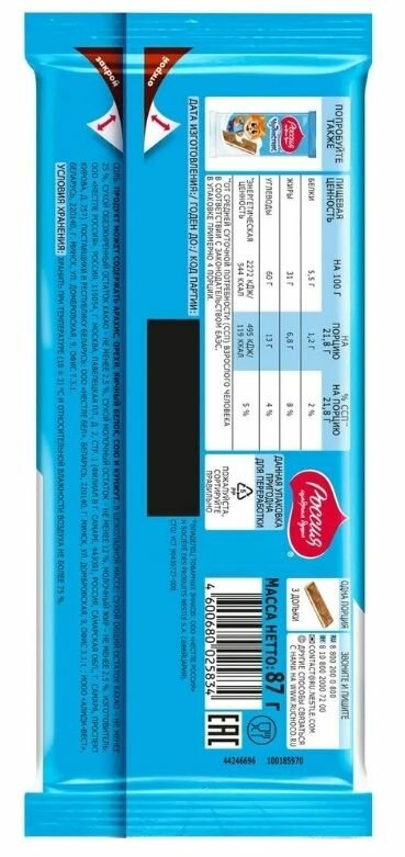 | Состав | сахар, молоко сухое цельное, жир специального назначения (из пальмового масла), масло какао, какао тертое, сыворотка молочная сухая, мука пшеничная (содержит глютен), эквивалент масла какао (масло пальмовое, масло ши), молочный жир, эмульгаторы (лецитины, Е476), крупа рисовая, жир специального назначения (из подсолнечного масла), крупа гречневая, вода, какао-порошок, ароматизаторы натуральные, крупа кукурузная, разрыхлители (Е500ii, E503ii), соль. |