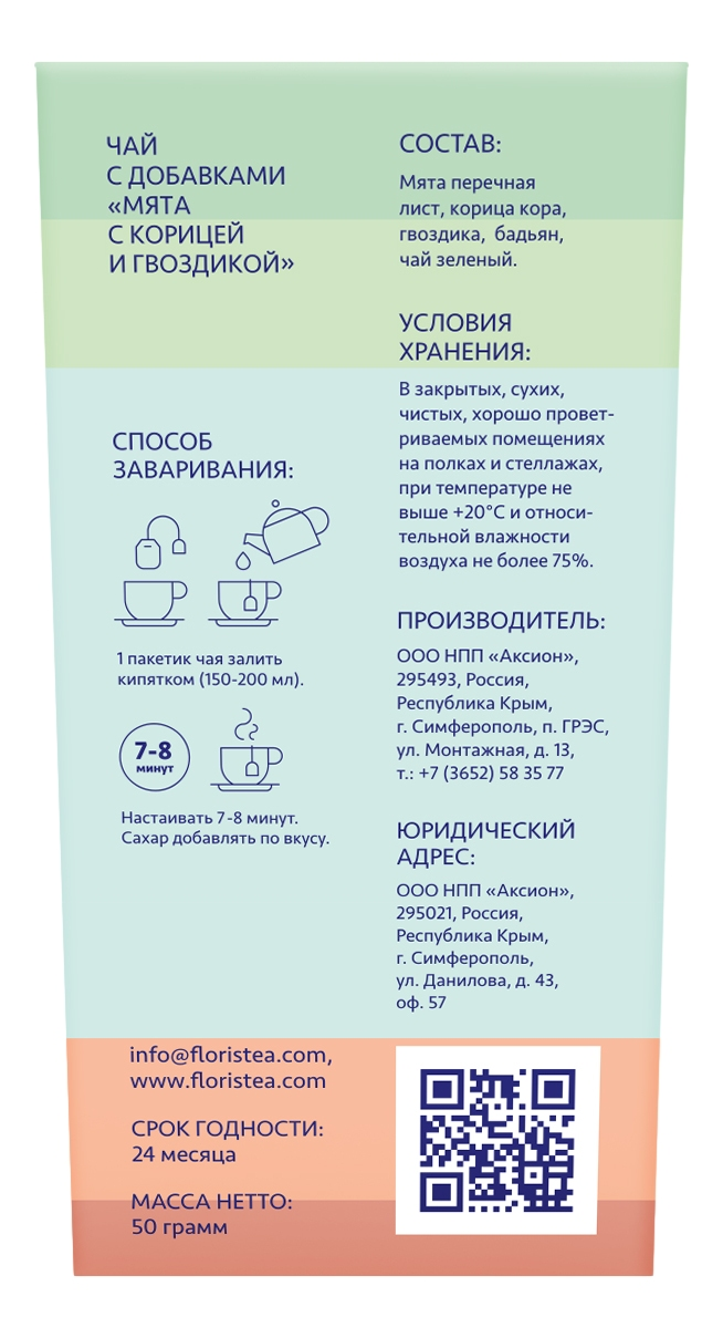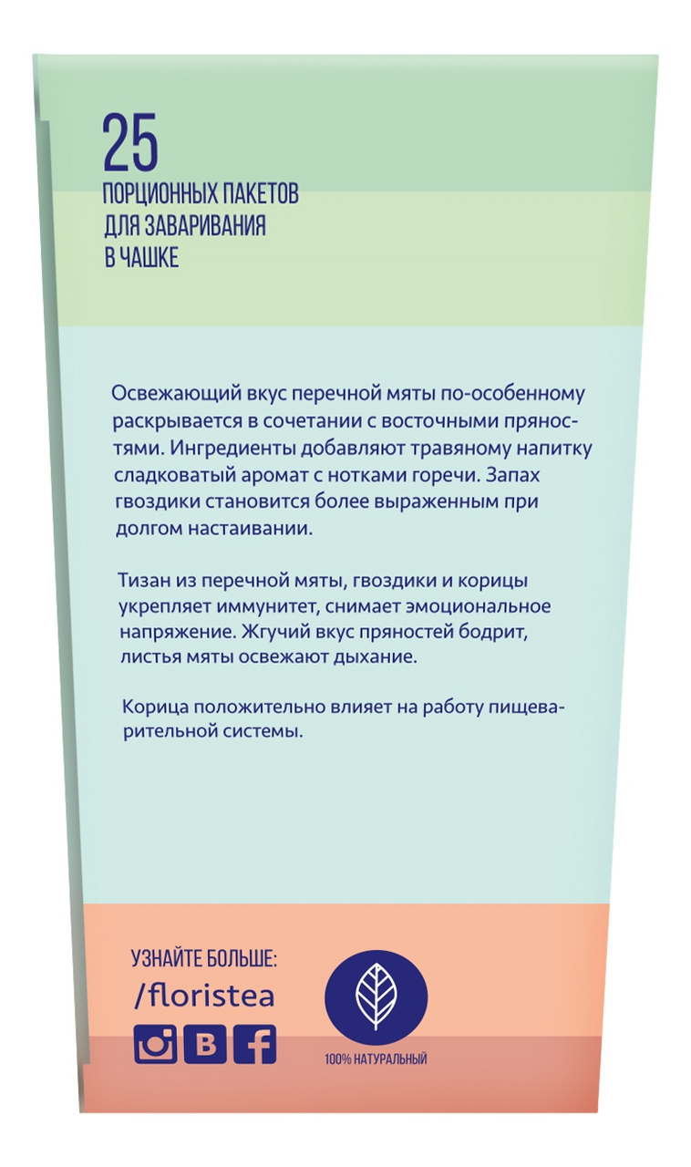 Чайный напиток Floris Мята с корицей и гвоздикой саше 50г Чай Floris травяной мята с корицей и гвоздикой 25 пакетиков по 2 г