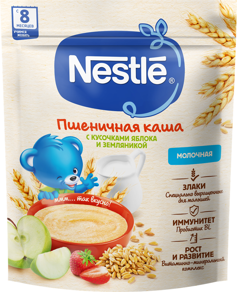Молочная пшеничная каша с кусочками яблока и земляникой для детей старше 8 месяцев согласно законодательству РФ.