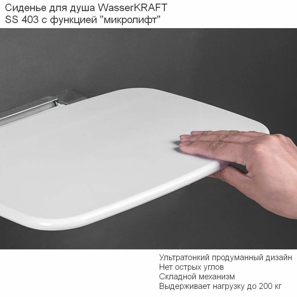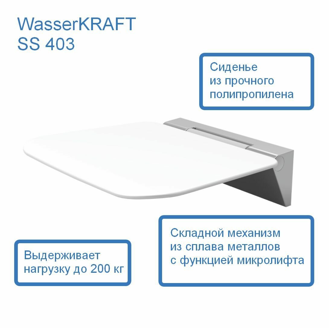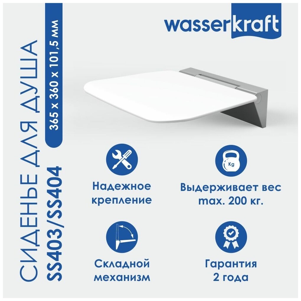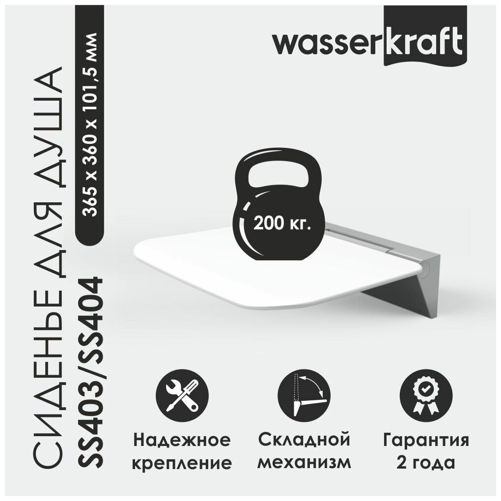 Сиденье для душа WasserKRAFT SS403 Сиденья для душа предназначены для того, чтобы наполнить удобством и комфортом зону душа. Это изделие понравится всем членам семьи. Всегда можно будет сесть и расслабиться, наслаждаясь моментом водных процедур. Если это не требуется, сиденье можно сложить к стене. Для пожилых людей это может стать необходимым аксессуаром, позволяя отдыхать ногам.Номинальный размер365*360*101,5 мм Характеристики:Цвет - белыйСплав алюминияВыдерживают вес max. 200 кг.Складной механизм из сплава металлов с функцией микролифта В комплект входит:Набор для монтажа Монтаж производится только в капитальную стену.