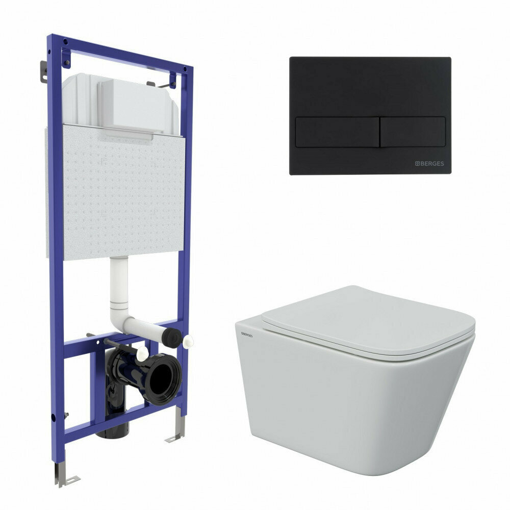 Комплект унитаза с инсталляцией Berges Wasserhaus Floe Rimless 043279 с сиденьем Микролифт и Черной матовой клавишей смыва