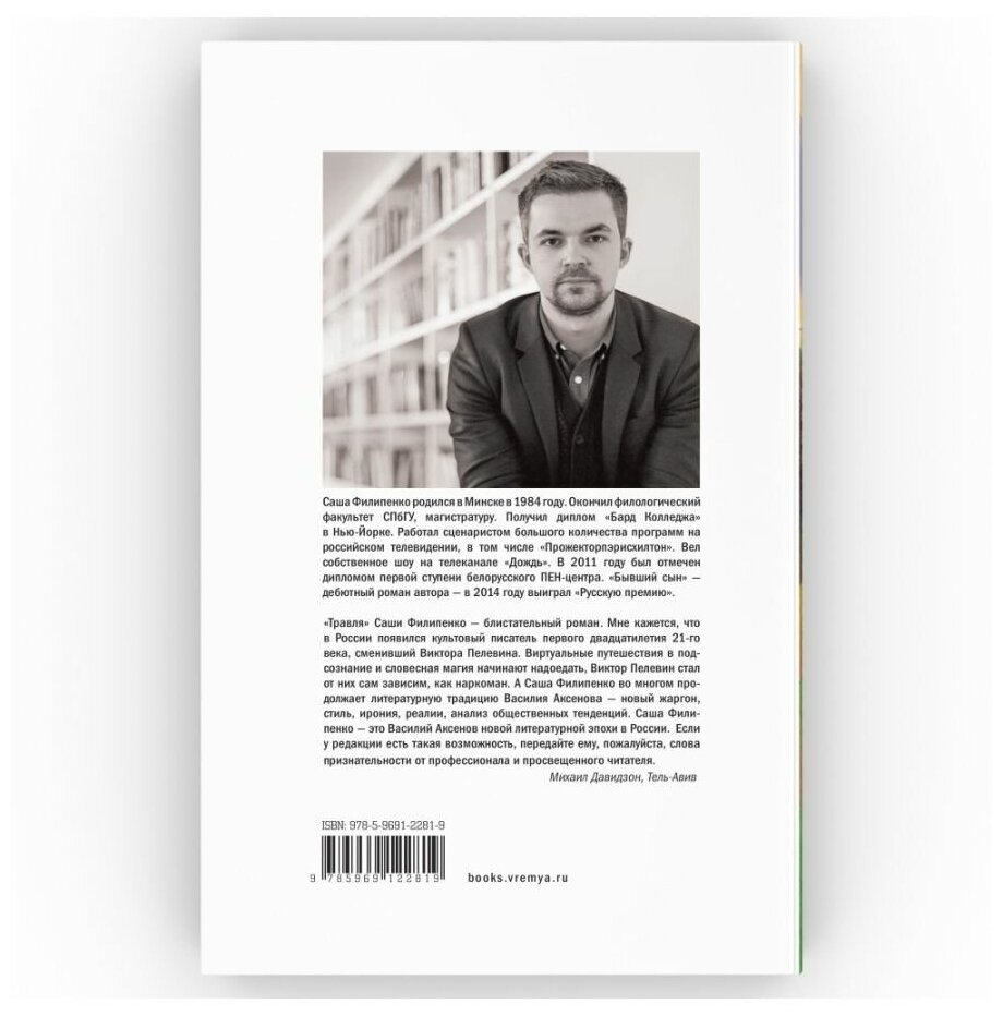 Саша Филипенко, как всегда (читай «Бывший сын» и «Замыслы»), актуален, наблюдателен, остроумен и — лаконичен. Ему снова удалось упаковать в небольшую книжку полноформатный остросюжетный роман. Конечно, налицо навык телевизионного сценариста Первого канала и «Дождя», но чувствуется и другое: герои Саши Филипенко — его ровесники и современники. Музыканты, футболисты, журналисты, политтехнологи… Им не повезло с эпохой. Они остро ощущают убегающую молодость, может быть, поэтому их диалоги так отрывочны и закодированы, а их любовь не предполагает продолжения. «Травля» — это история о том, что цинизм и ирония — вовсе не универсальная броня. И что попытка проскользнуть между совестью и подлостью может закончиться СМС на экране телефона: «On vybrosil rebenka iz oknа (((…». Саша Филипенко родился в Минске в 1984 году. Окончил филологический факультет СПбГУ, магистратуру. Получил диплом «Бард Колледжа» в Нью-Йорке. Работал сценаристом большого количества программ на российском телевидении, в том числе «Прожекторпэрисхилтон». Вел собственное шоу на телеканале «Дождь». В 2011 году был отмечен дипломом первой ступени белорусского ПЕН-центра. «Бывший сын» — дебютный роман автора — в 2014 году выиграл «Русскую премию».