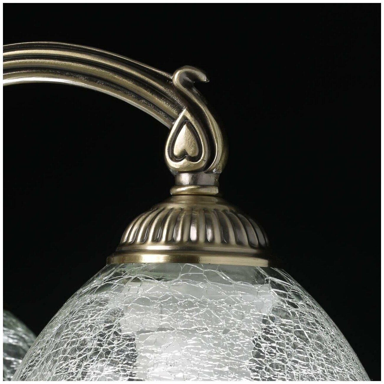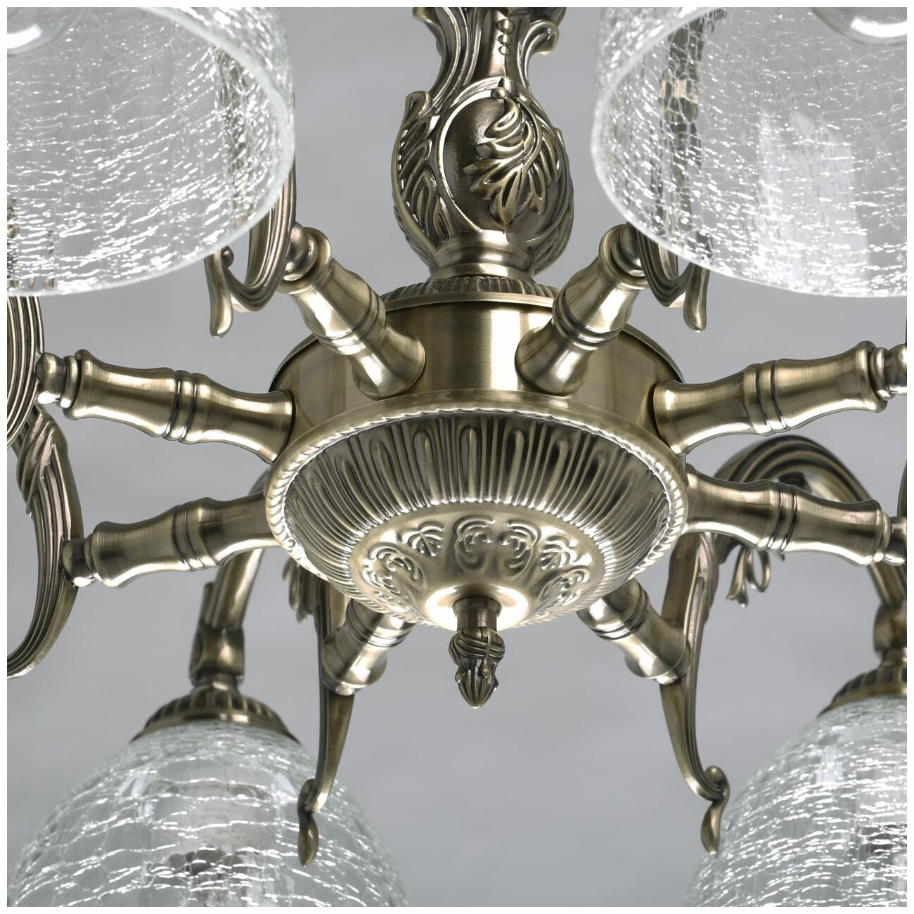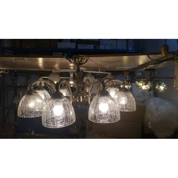Основание светильника выполнено из комбинации сплавов металлов и гальванизировано в цвет античной бронзы. Корпус и потолочная чаша выполнены из металла по технологии прессования. Рожки и центральная ось выполнены из сплава алюминием с цинком по технологии художественного литья. Потолочная люстра декорирована прозрачными стеклянными плафонами вниз, выполненными по технологии кракелирования.