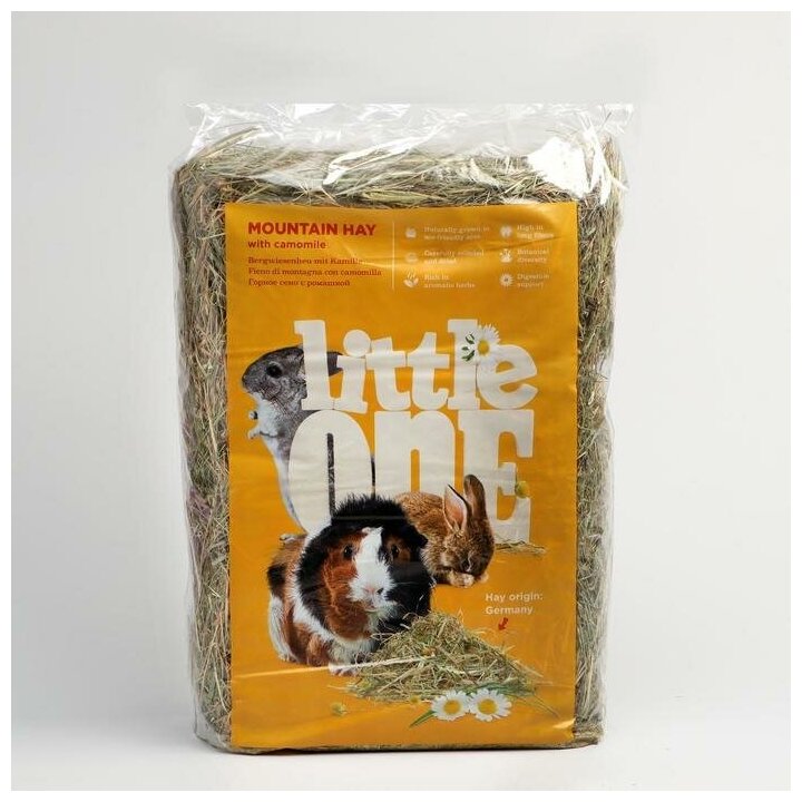 Горное сено с ромашкой Little One — ароматное, очищенное и высушенное. собрано в экологически чистых горных районах и обогащено цветами ромашки. Сено является основной составляющей рациона всех травоядных животных (кроликов, морских свинок, шиншилл, дегу), поэтому важно обеспечить его постоянное наличие в клетке...Сено Little One с ромашкой имеет разнообразный ботанический состав. Оно богато грубой клетчаткой, что необходимо для здоровья зубов и оптимального пищеварения декоративных животных. Ромашка уменьшает газообразование и нормализует работу желудочно-кишечного тракта. Обладает мягким противовоспалительным эффектом. ..Так как животные могут зарываться в сушеной траве и строить из нее гнезда, сено также служит прекрасной подстилкой и развлечением для всех домашних питомцев...Ингредиенты. Горное сено. Цветки ромашки (5%)..Пищевая ценность. белки – 10,6%. жиры – 2,1%. клетчатка – 29,2%. зола – 8,3%