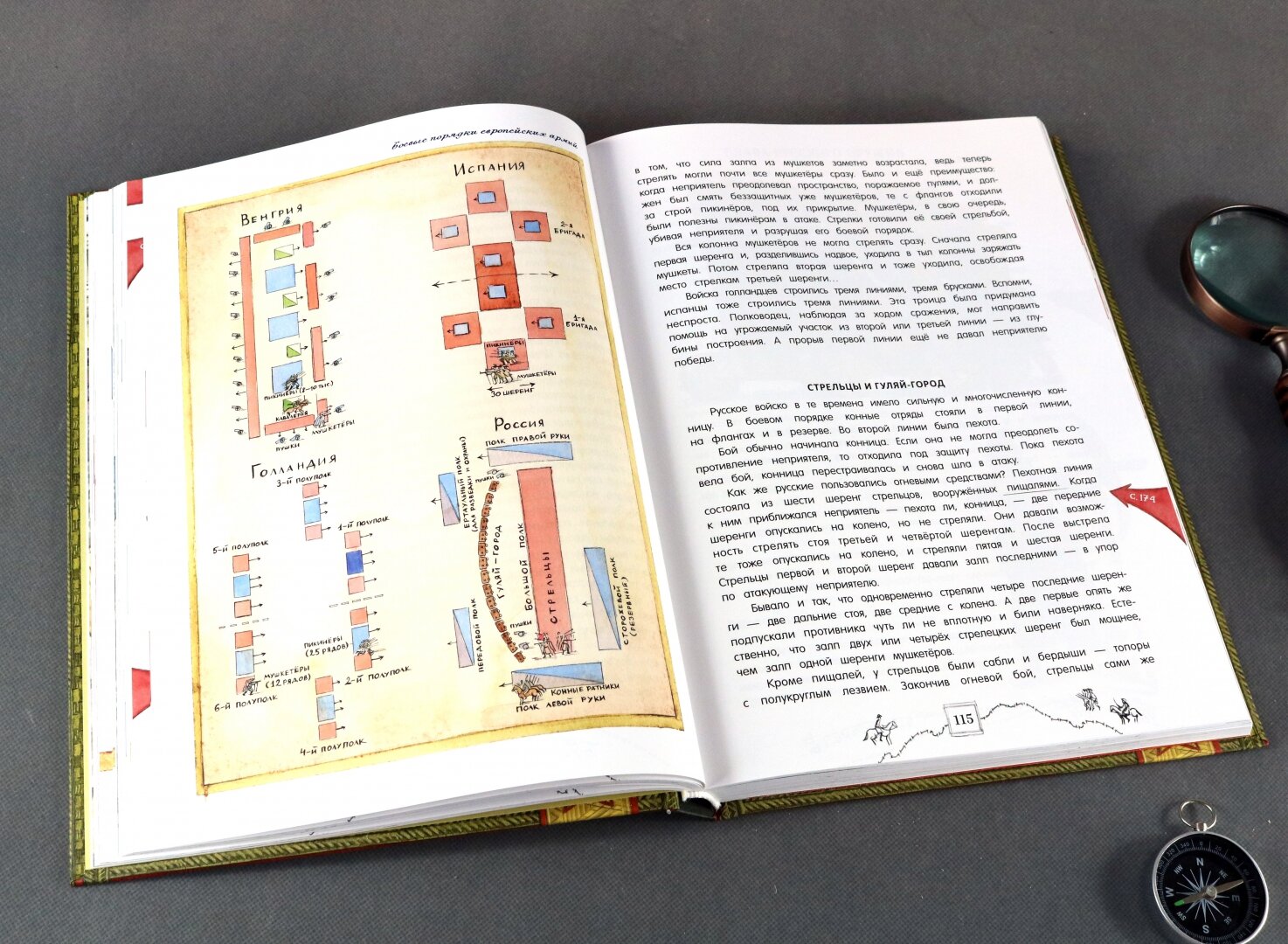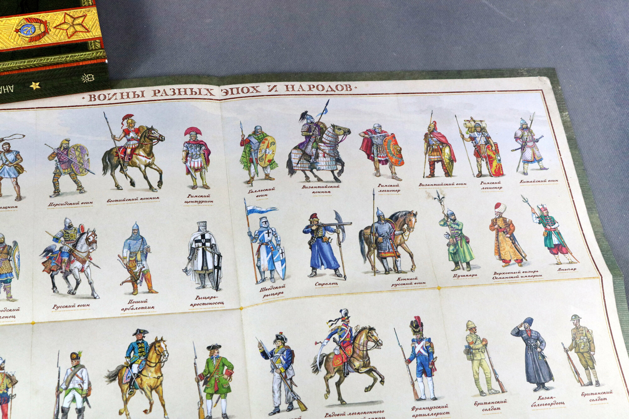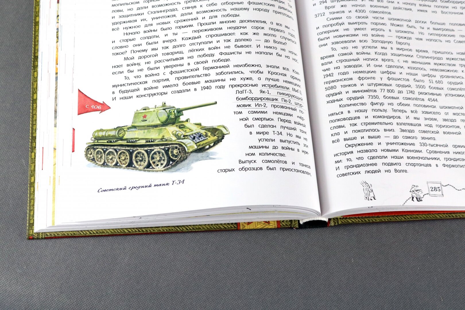 Что меня поразило сначала - это вес книги. Одной рукой ее поднять или удержать сложно. Выглядит она как настоящий музейный артефакт. На развороте погоны солдат и офицеров Советской и Российской армии. Внутри рассказ о военном искусстве сквозь века эпохи и битвы. Очень интересно сделана система сносок и ссылок на визуальный словарь. Следите за специальными стрелочками на полях. Иллюстраций много, чем-то они напоминают мне стиль незабвенных детских энциклопедий "Аванты", помните, такие были раньше? В самом конце сюрприз - плакат в конверте.
